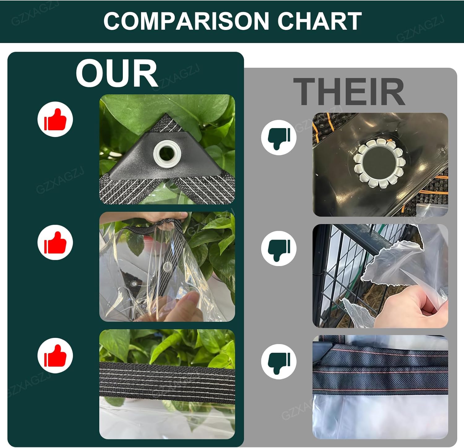 GZXAGZJ is dedicated to creating high-quality,heavy duty clear tarp. When a storm obscures your view,we’ve created a 14-mil,ultra-clear tarp that keeps you hidden and visible.It’s 99% waterproof and 100% transparent.Admire the dancing raindrops and count the twinkling stars.True protection shouldn’t obscure sunlight or vision