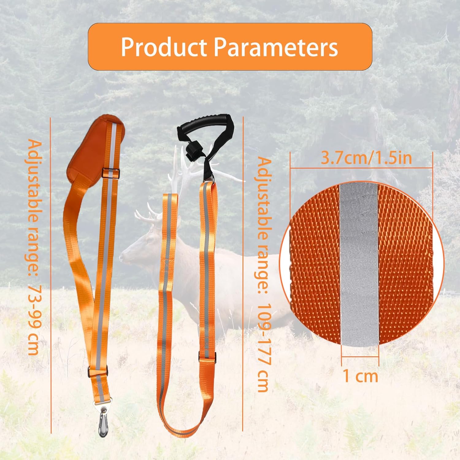 ADJUSTABLE: The length of our deer drag line and harness is adjustable, the adjustable length of the shoulder strap is 0.73M–1M, the adjustable length of the deer drag rope is 1.1M-1.8M.