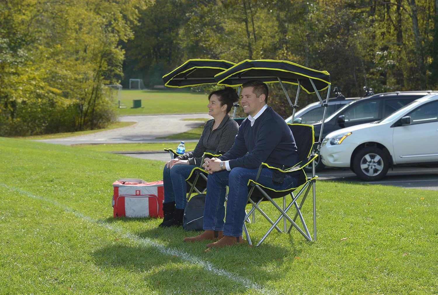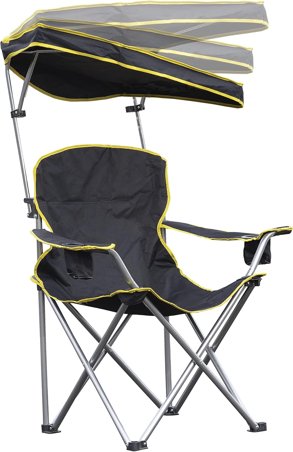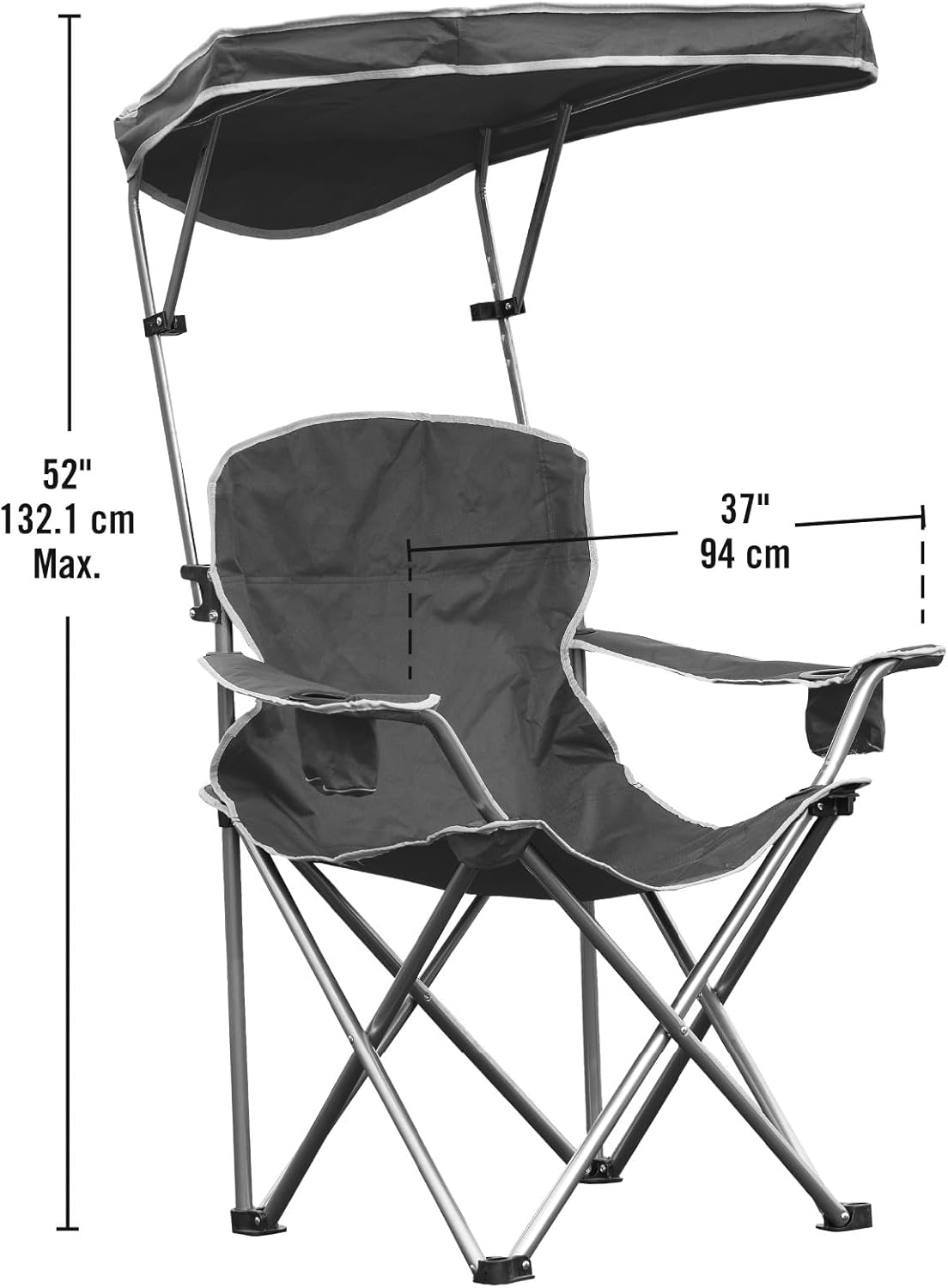 FOLDING OUTDOOR CHAIR: Portable beach, camp, or lawn chair with patented tilt shade canopy and mesh cup holders
