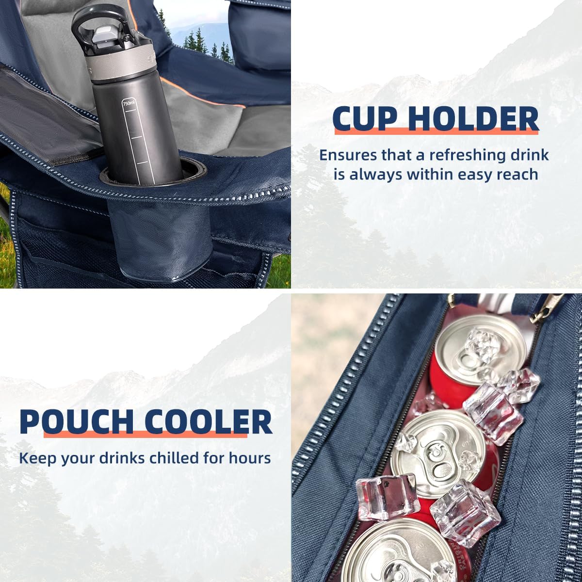 Convenient Cup Holder Design: Features built-in dual cup holders to securely hold drinks, phones, snacks. Perfect accessory for camping festivals, picnics, bonfire nights