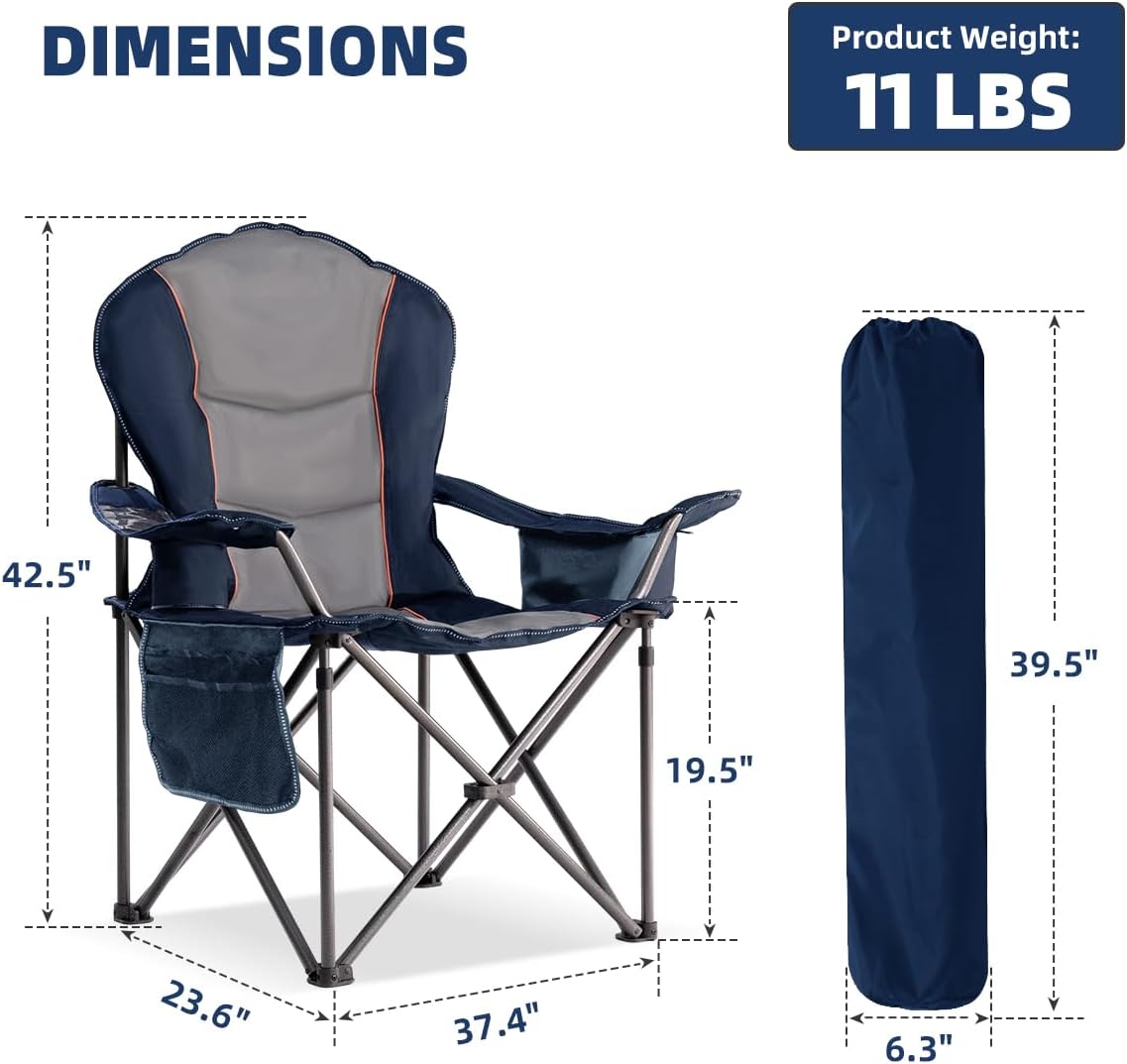 Ergonomic Camping Chair with Lumbar Support: Experience premium comfort with height-adjustable armrests, waist strap, and full-back padded design. The ergonomic high backrest and oversized seating area provide full-body support for camping, fishing, or backyard relaxation