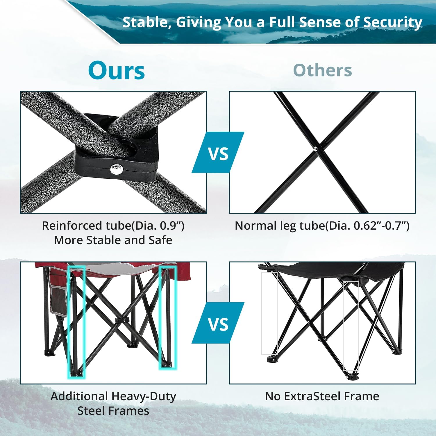 DURABLE AND LOAD-BEARING: The camping chair can withstand a weight of 450 pounds and is made of thickened steel pipes Made of X-shaped steel bars and four heavy-duty steel frames, it improves the stability of use.