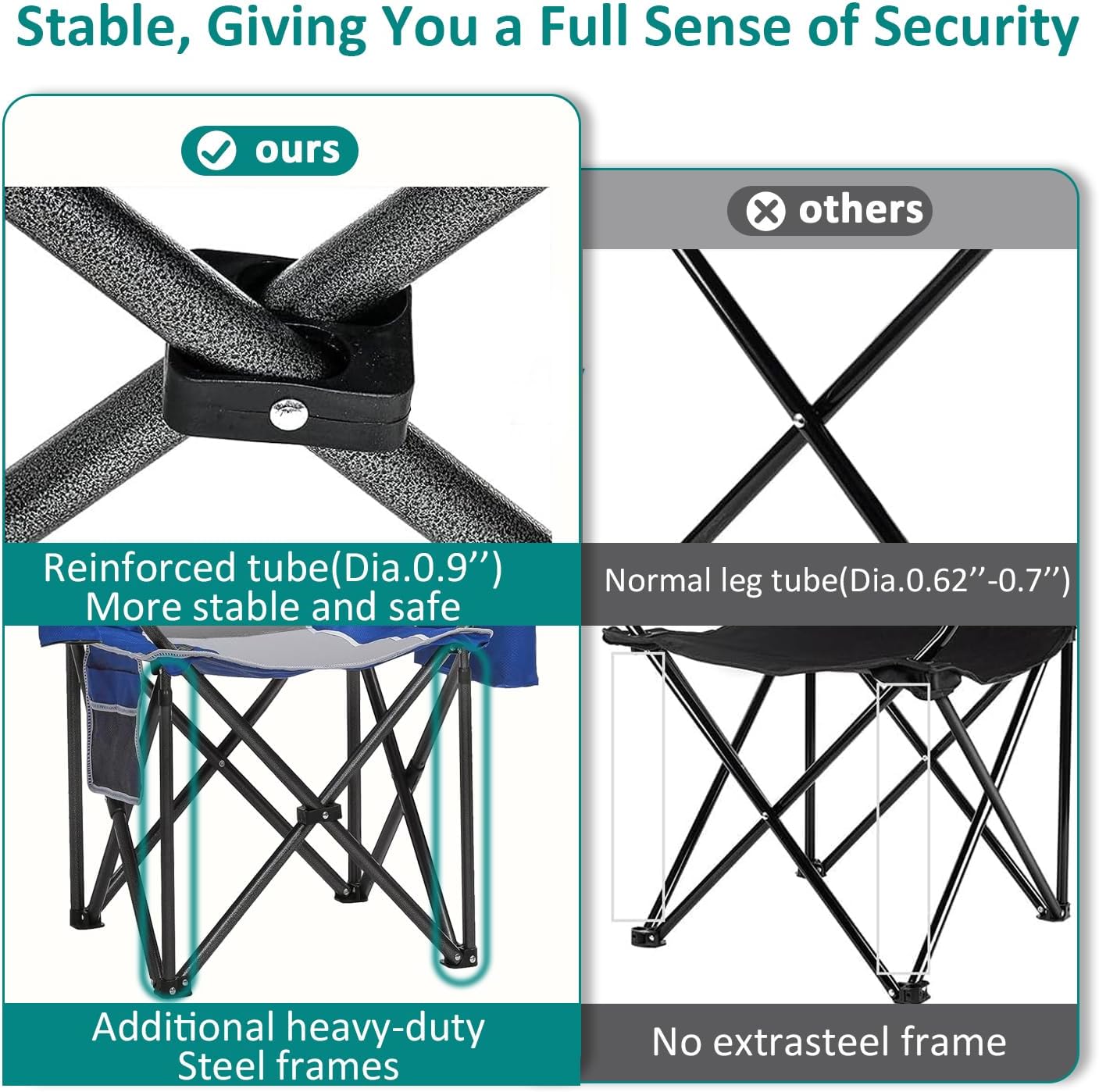 Stable on Any Terrain: Large anti-sink feet provide excellent stability on grass, sand, or uneven ground, ensuring a safe and comfortable seating experience wherever you go.