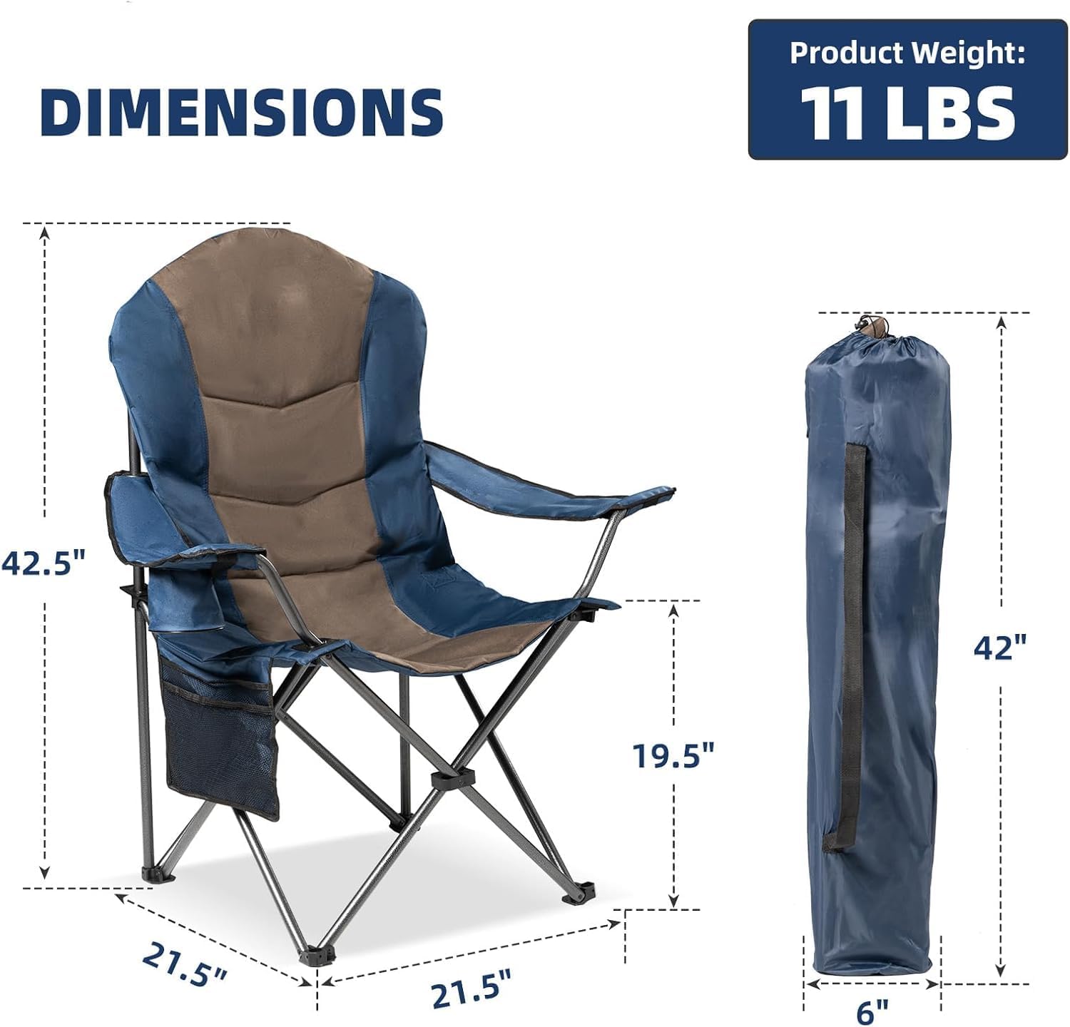 EXTRA-WIDE SEAT & ERGONOMIC COMFORT: 21.5″ oversized camping chair for big and tall adults with 19.5″ ergonomic height. High-density foam padding + adjustable armrests + removable headrest deliver first-class relaxation