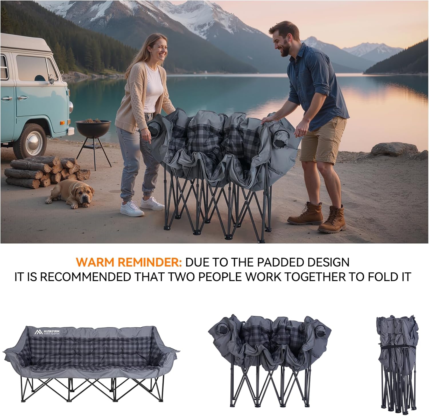 Spacious & Comfortable 3 Person Camping Chair: This oversized three-person camping chair accommodates up to 3 adults with dimensions of 74.8″ (L) x 21.6 ” (W). Featuring PE non-slip foot pads, it’s ideal for use on grass, sand, or rocky terrain, making it a perfect camping couch.