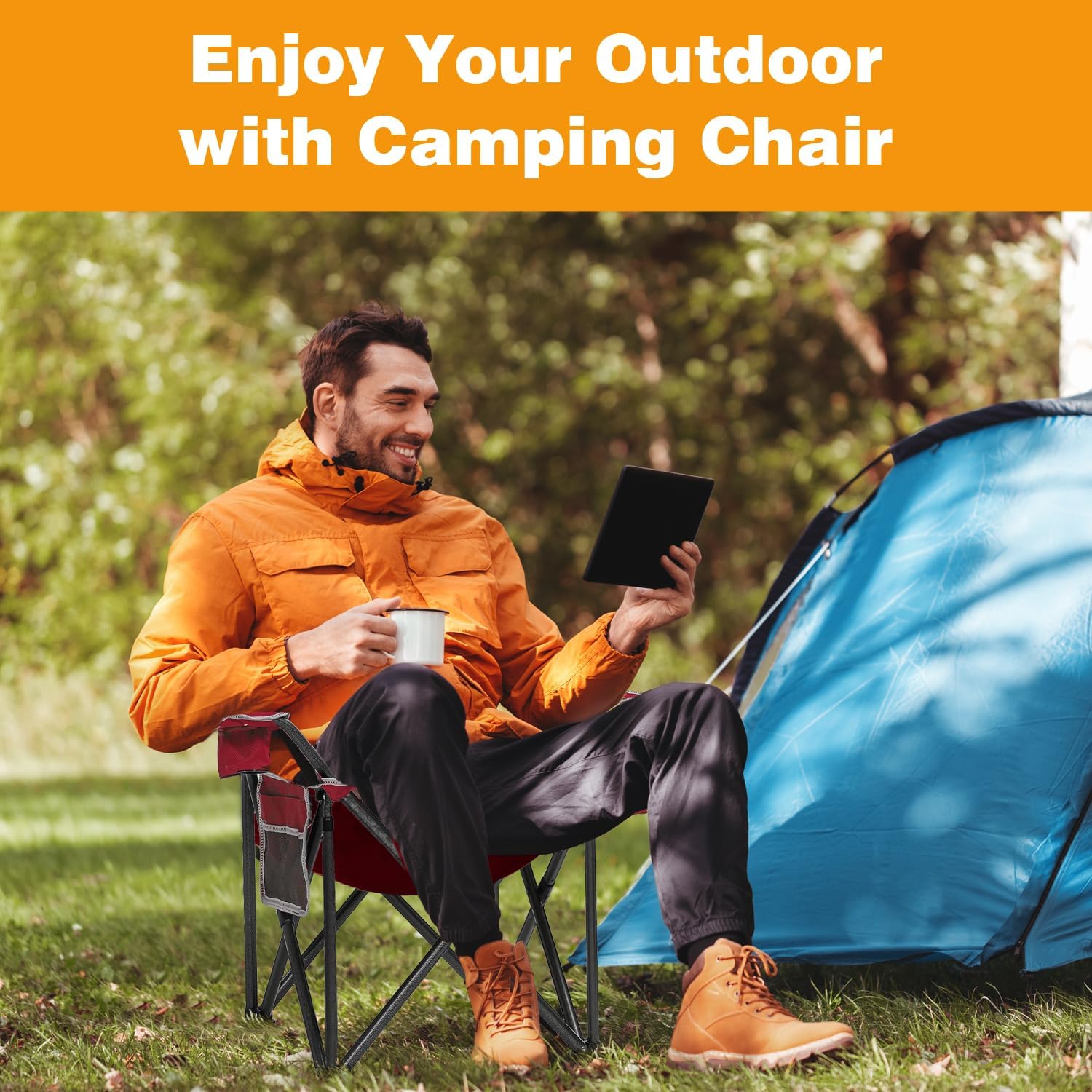 DURABLE: The camping chair can bear up to 450 pounds and is made of thick and sturdy steel pipes, X-shaped steel bars, and four heavy-duty steel frames, which greatly improve stability and load-bearing capacity.