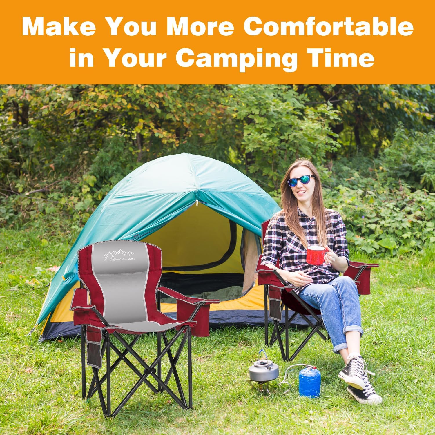 DURABLE: The camping chair can bear up to 450 pounds and is made of thick and sturdy steel pipes, X-shaped steel bars, and four heavy-duty steel frames, which greatly improve stability and load-bearing capacity.