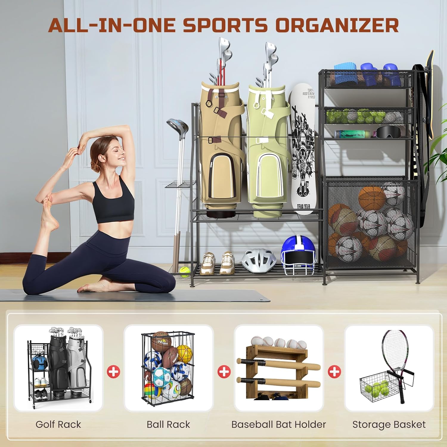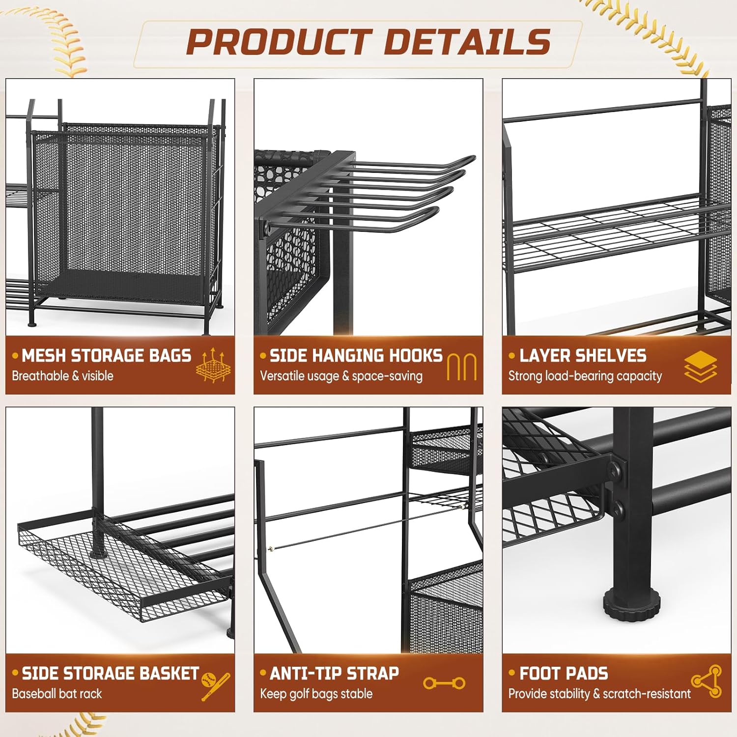 【Heavy-Duty & Durable Construction】: Built with a sturdy metal frame and reinforced polyester baskets, this sports organizer holds up to 256 pounds. Its anti-slip foot pads keep it stable and protect your floors from scratches, the rust-resistant steel and durable materials ensure long-lasting performance.