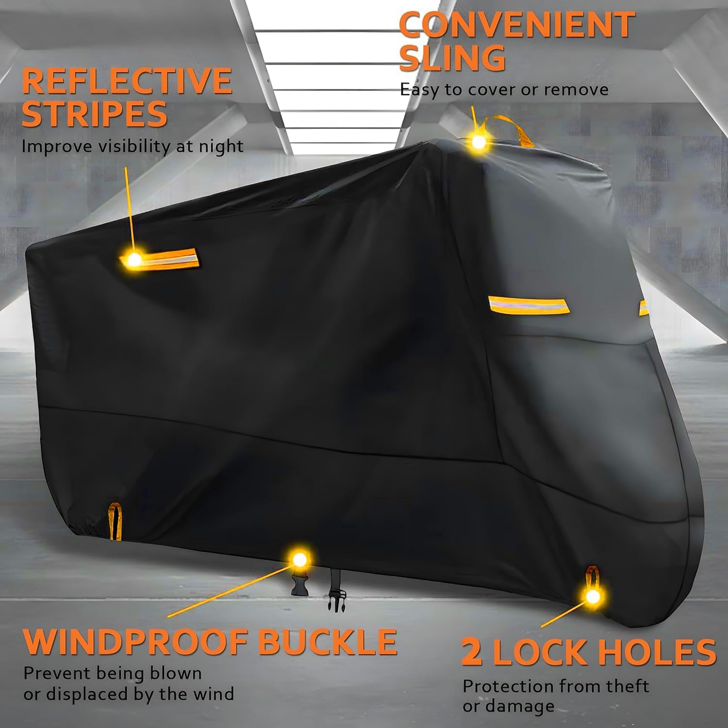 [Windproof Details] – The bike rain cover features elastic band at the bottom for a snug fit around your bike. It also has windproof buckle in the center that can be tightened to prevent the cover from being blown away. This design ensures your bike stays protected, even in windy conditions.