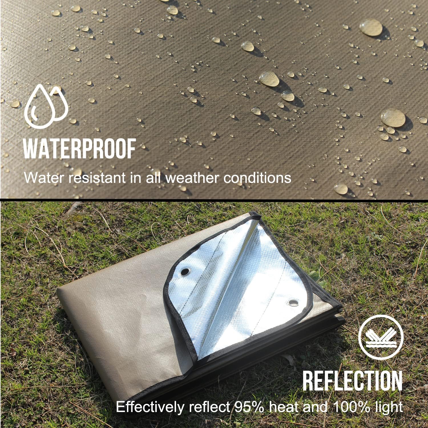 ⛺️【Reusable and Durable】Rugged 4 Layers including PE, Polyester Mesh and Aluminum Foil. Suitable for Many Situations, including Raincoat, Camping, Hiking, Mountainning, Snowfield and Heavy Duty. Also Can be Used as Car Protection, Sunshine Shelter, Pets Shelter, SOS Signal, Solar Heater for Many Times.