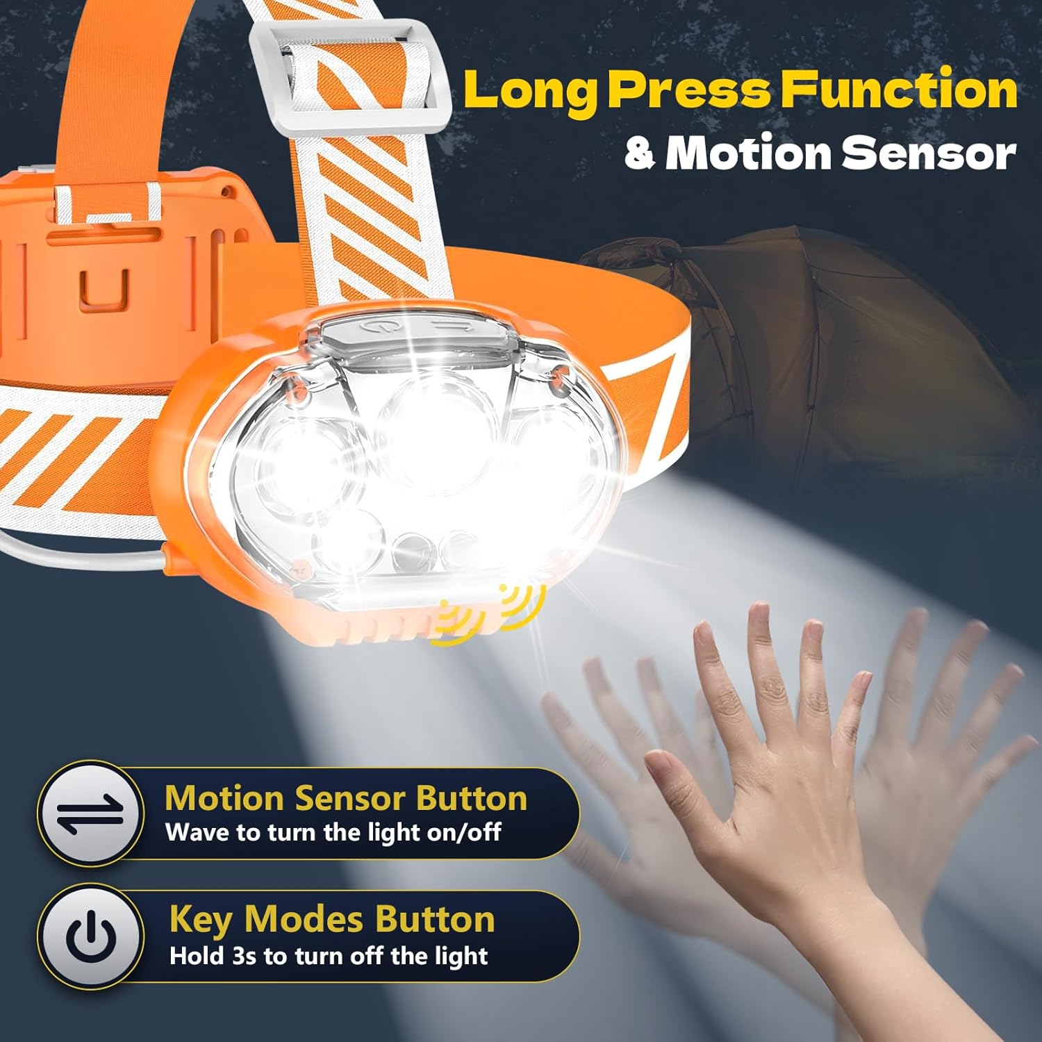 Long Press and Motion Sensor: In any mode, press the on switch button for 3 seconds, the rechargeable headlamp flashlight will turn off directly, no need to cycle through all the modes. The headlights for head is also equipped with the smart motion sensor, which easily controls the headlamps for adults on and off with a wave of your hand, more convenient for your work