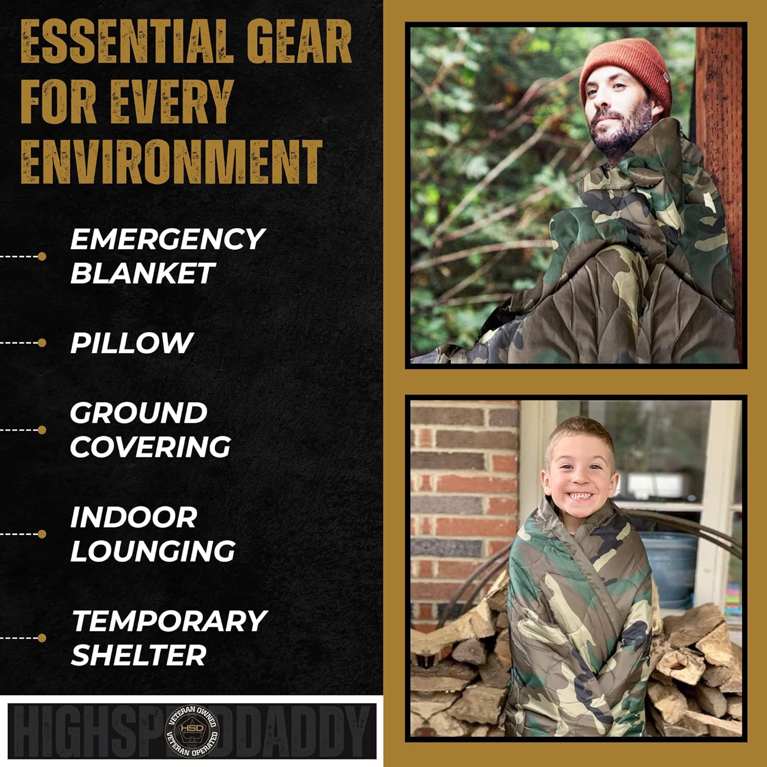 ESSENTIAL GEAR FOR EVERY ENVIRONMENT: With its mindful design and undeniable edge, the HighSpeedDaddy woobie shines in every tactical situation. Use it as an emergency blanket, ground covering, concealment blind, tent divider, temporary shelter, pillow, sleeping bag, or insulator to provide comfort in even the most uncomfortable situations. But versatile and convenient, woobies also prove clutch at the beach, park, the bonfire, the campsite, your afternoon picnic, and even for indoor lounging.