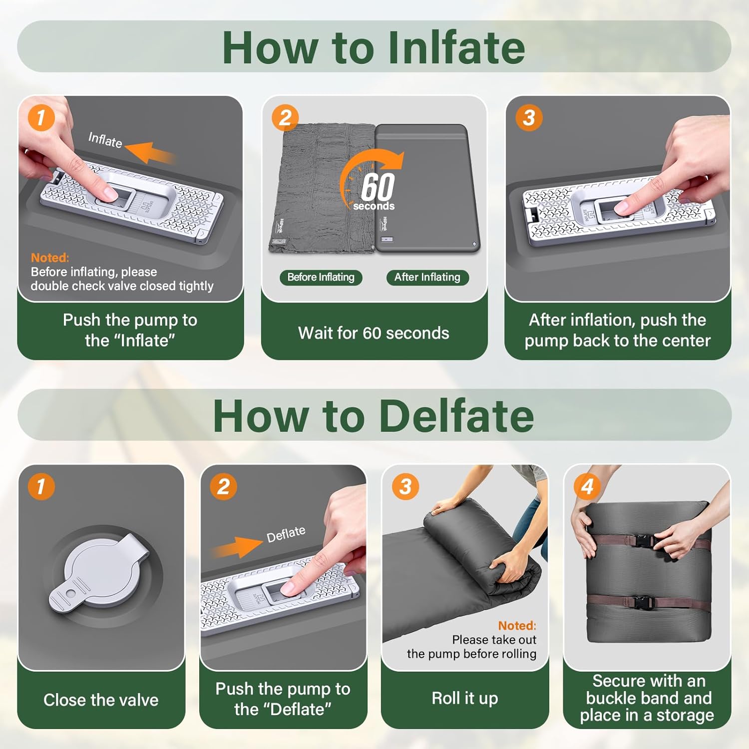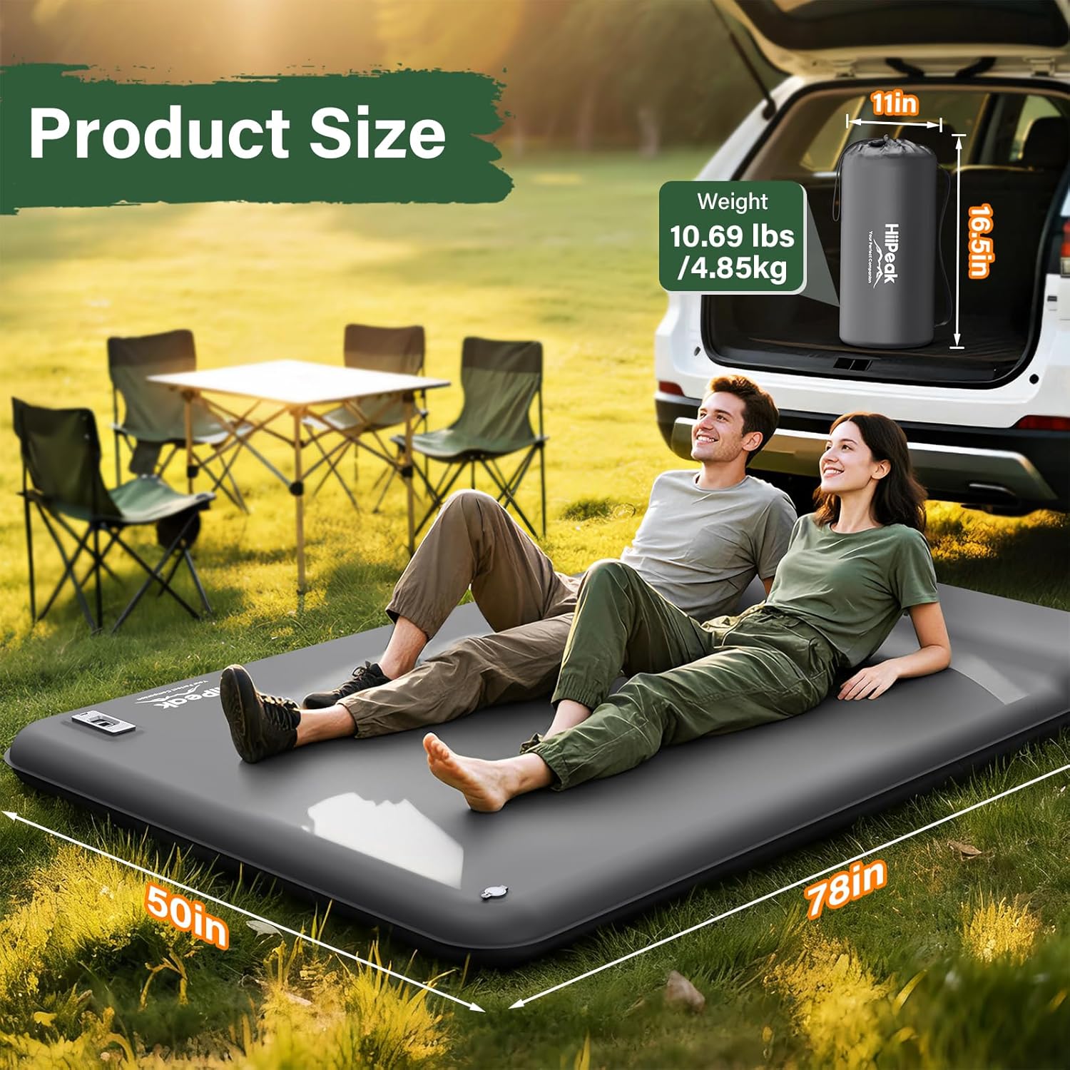 Quickly One Touch Electric Inflation & Deflation: HiiPeak double sleeping pad features a built-in electric pump for one-touch Auto inflation and deflation-No foot-pumps, No Blowing.Air pump is rechargable and detachable, USB-C charging is more convenient. Vacuum compression storage greatly saves space, so you can say goodbye to manual pumping and bulky storage—just enjoy a smoother camping experience.Before using the sleeping pad, please fully charge the air pump first! Noted: The pump runtime is approx. 20 minutes; inflation takes about 1 minute, deflation about 2 minutes.