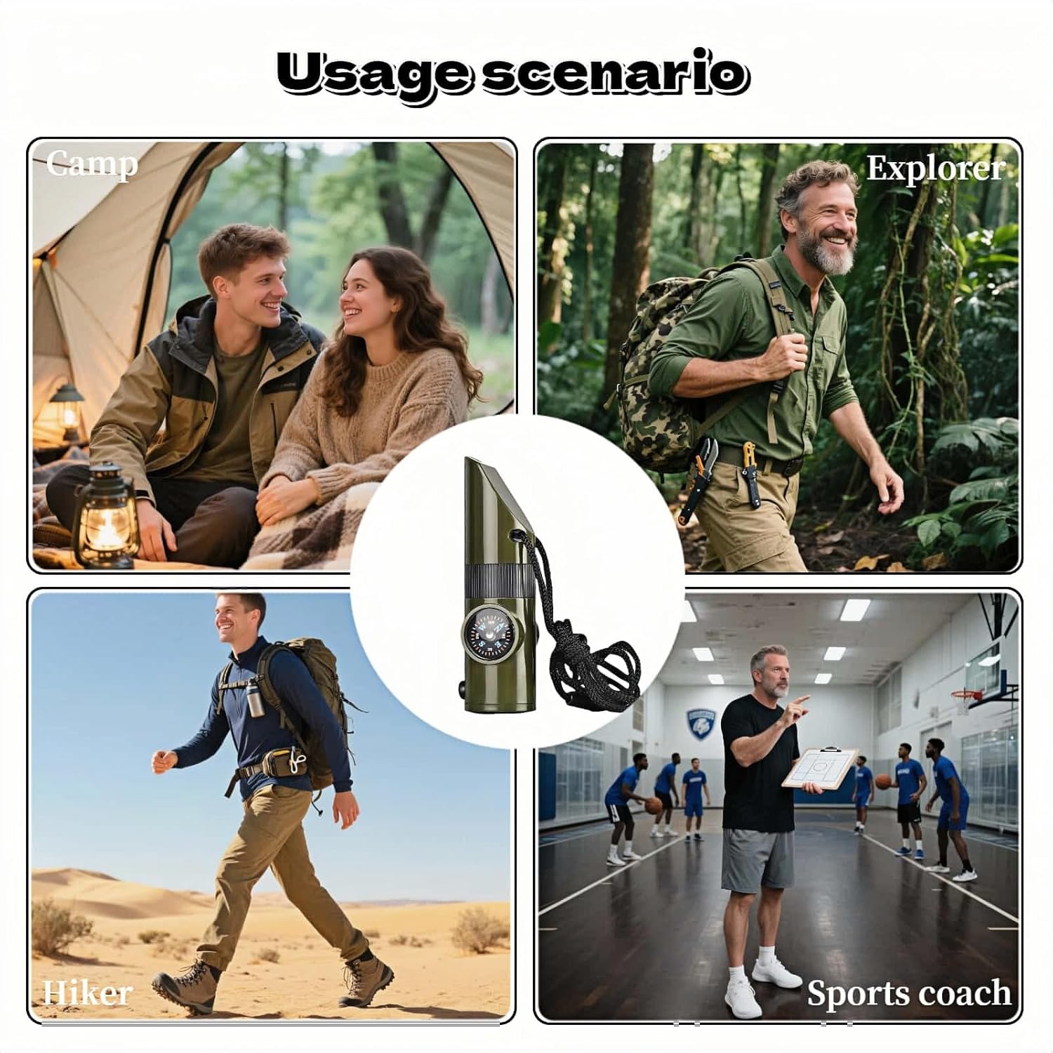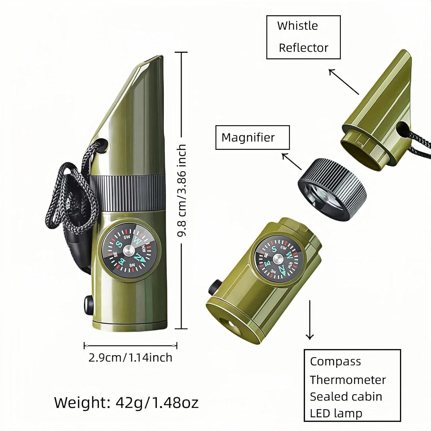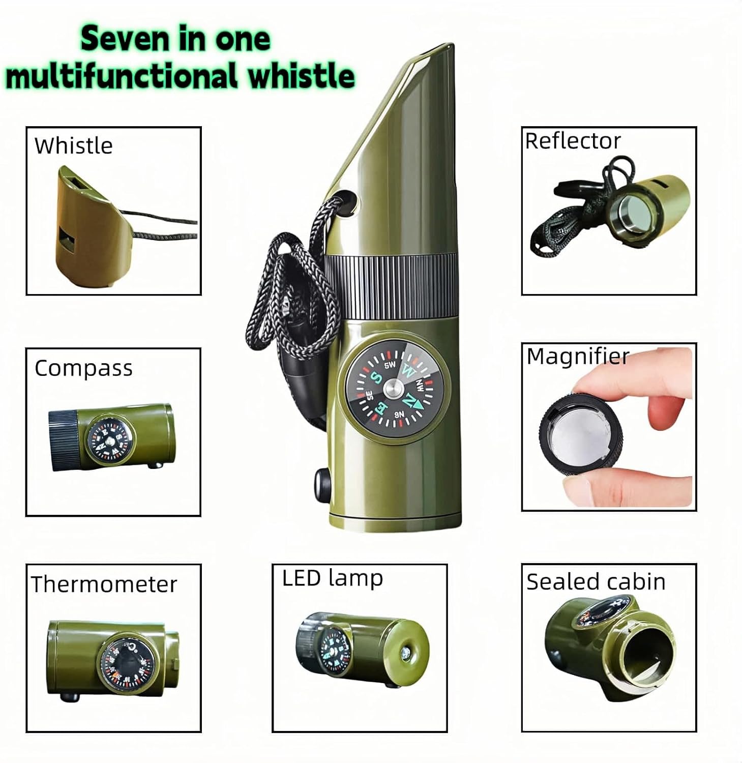 🔥 120dB Lifesaving Whistle + 7-in-1 Survival Kit Crystal-loud whistle cuts through storms (louder than screams!) when drowning. All-in-1 emergency tool: LED flashlight, magnifying fire starter, signal mirror, compass, thermometer & waterproof pill capsule. Unbreakable ABS withstands drops/heat. Save space, save lives.