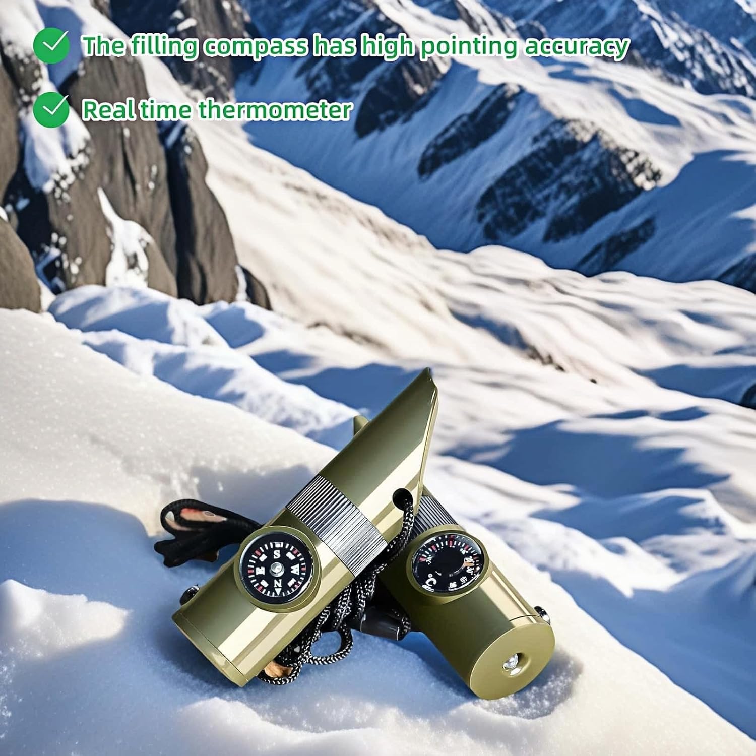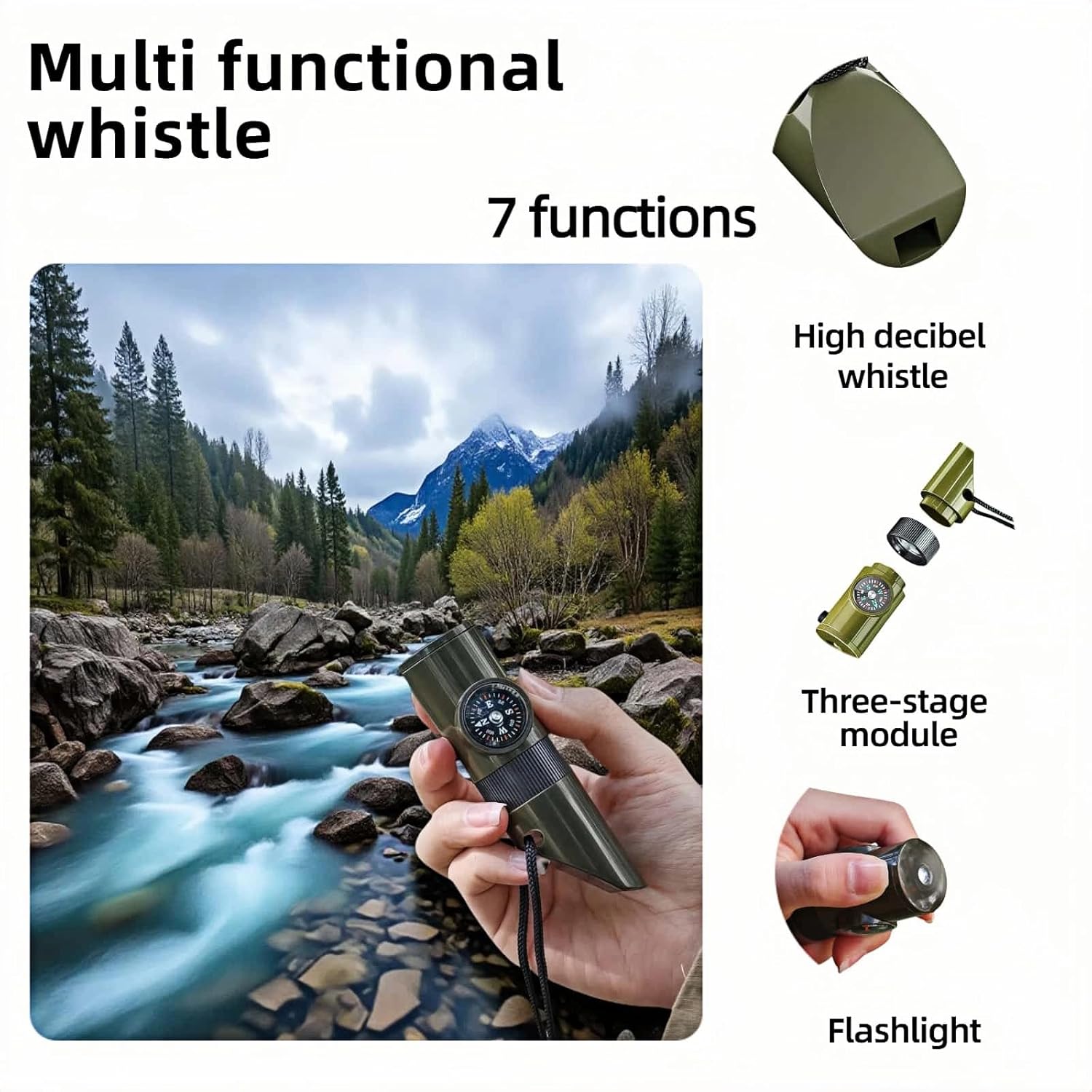 🔥 120dB Lifesaving Whistle + 7-in-1 Survival Kit Crystal-loud whistle cuts through storms (louder than screams!) when drowning. All-in-1 emergency tool: LED flashlight, magnifying fire starter, signal mirror, compass, thermometer & waterproof pill capsule. Unbreakable ABS withstands drops/heat. Save space, save lives.