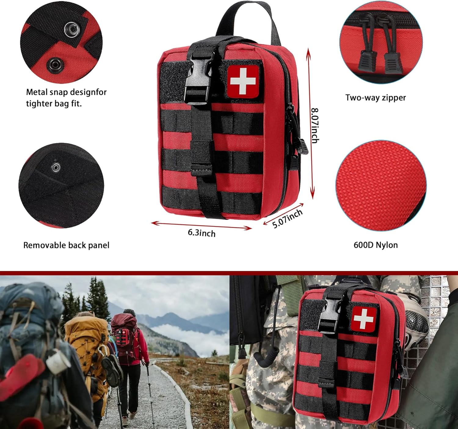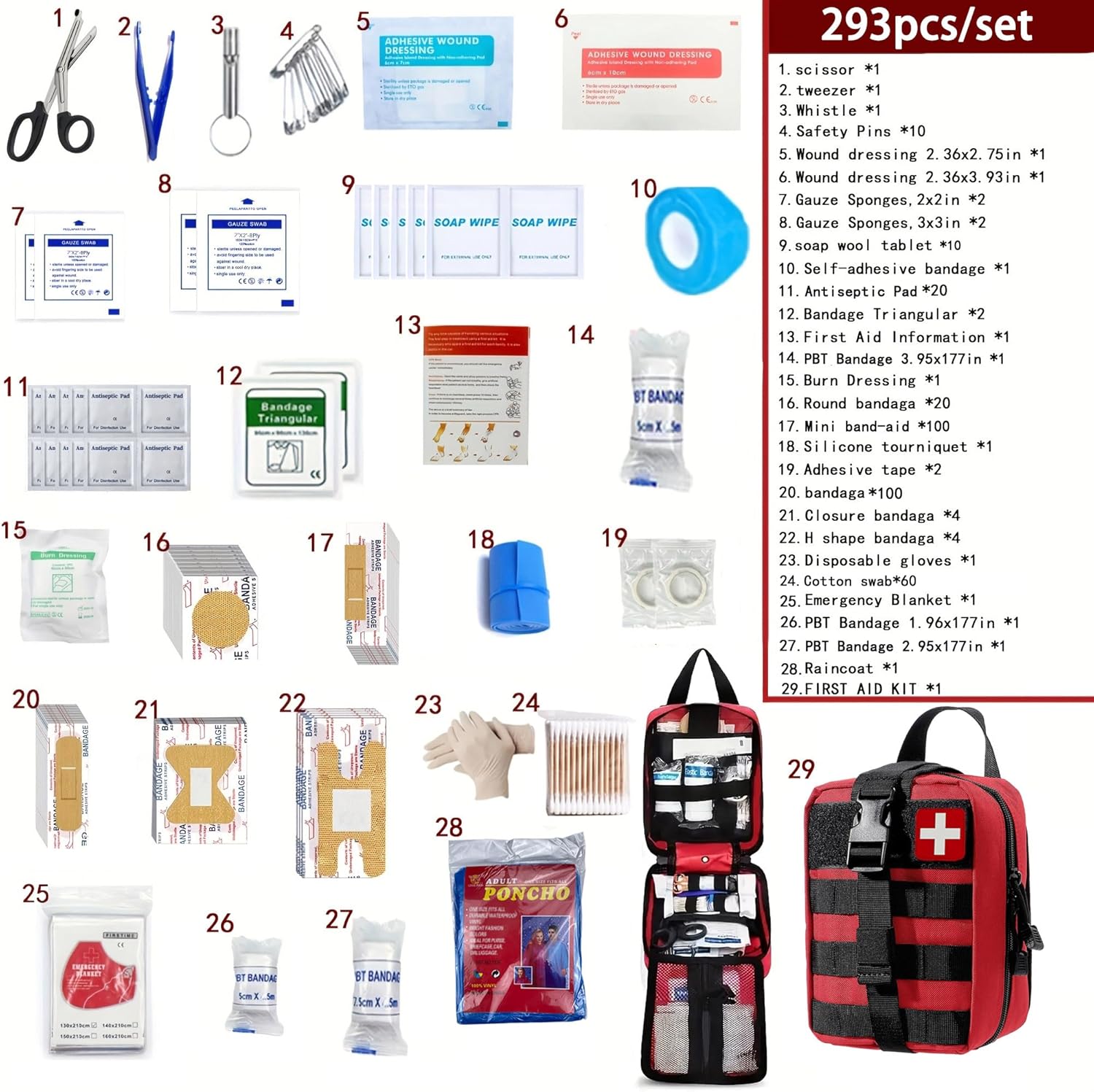 【✅】293-Component Emergency Response Ecosystem→ Military-spec 800D Oxford construction with dual YKK storm zippers→ Rapid-access hook-and-loop panel organizes: trauma shears, splinter forceps, adhesive bandages, self-adhering bandages, emergency rain poncho, nitrile gloves, survival blanket, illustrated response guide, cleaning wipes, tape, gauze pads, safety pins→ Each element precision-curated for scenarios where minutes determine outcomes