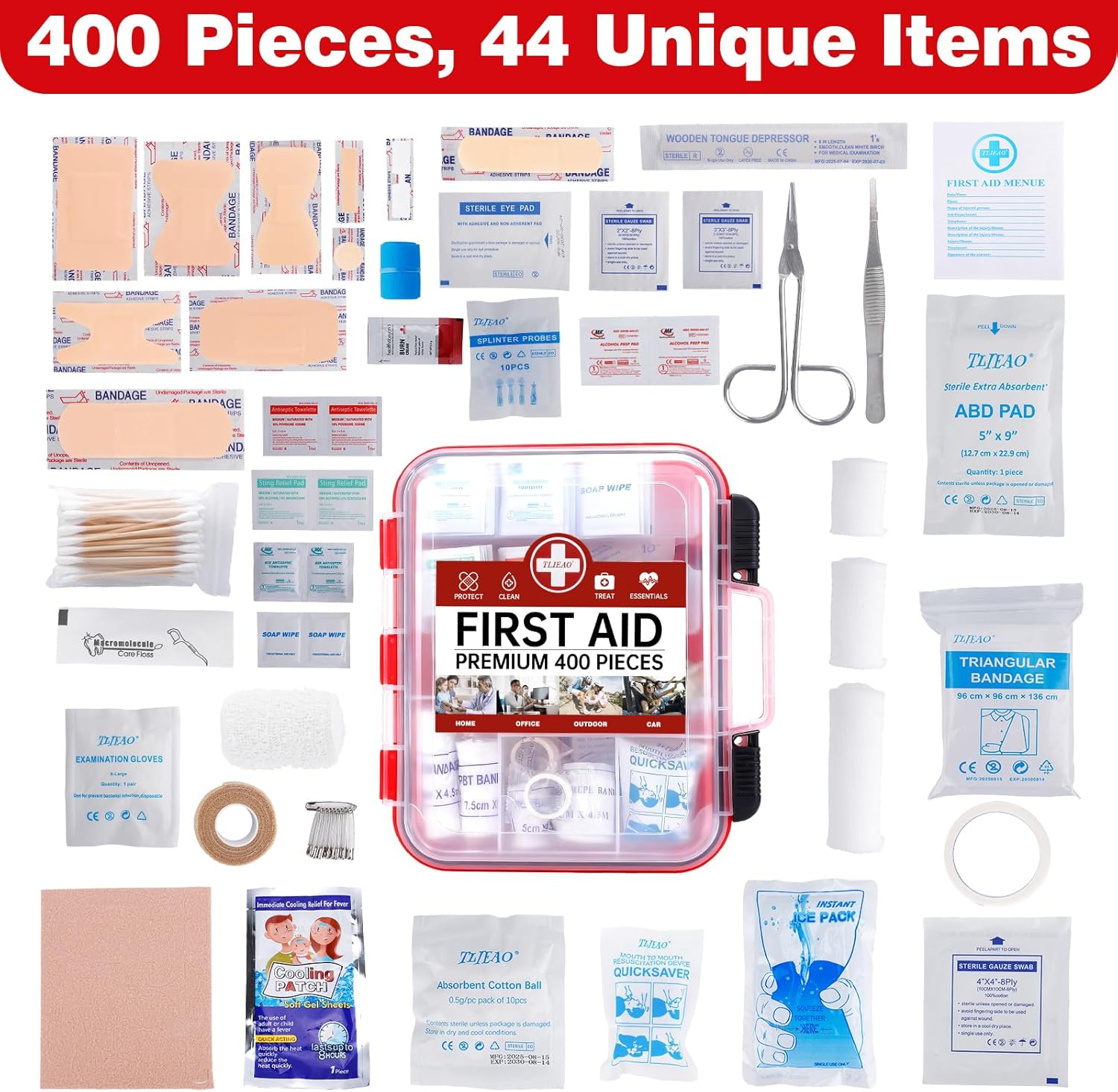 ESSENTIALS FOR EMERGENCY – Be prepared for any minor emergency with 400 pieces of premium medical supplies. This kit includes assorted bandages, gauzes, pads, burn gel, an instant cold pack, medical tapes, gloves, and more. It meets international medical standards and is suited for treating cuts, scrapes, sprains, and burns.