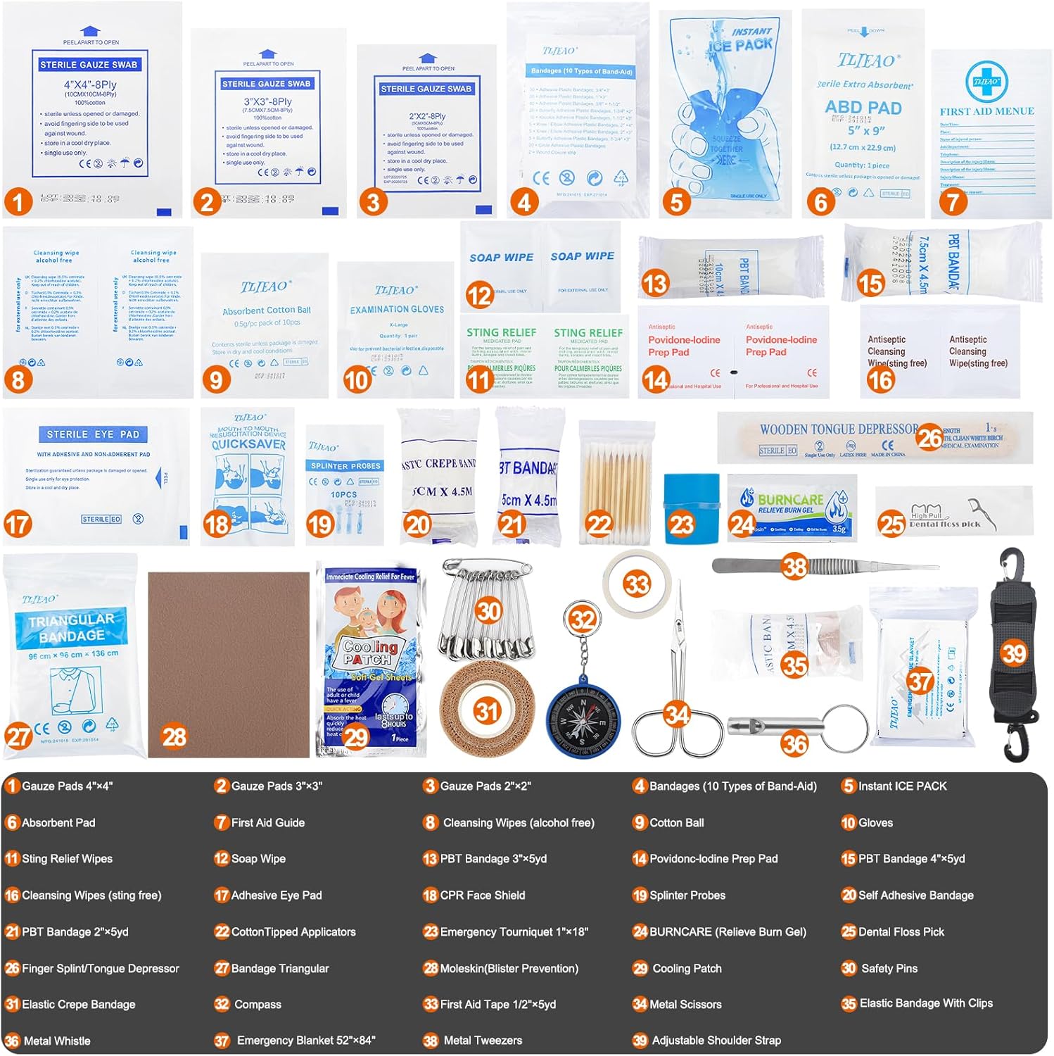 Emergency Essentials: This kit has everything you need! Fully packed with 430 professional medical supplies – all kinds of bandages, gloves, povidone-lodine prep pad, tourniquet, etc. with such items you can get ready for unknown situations better.