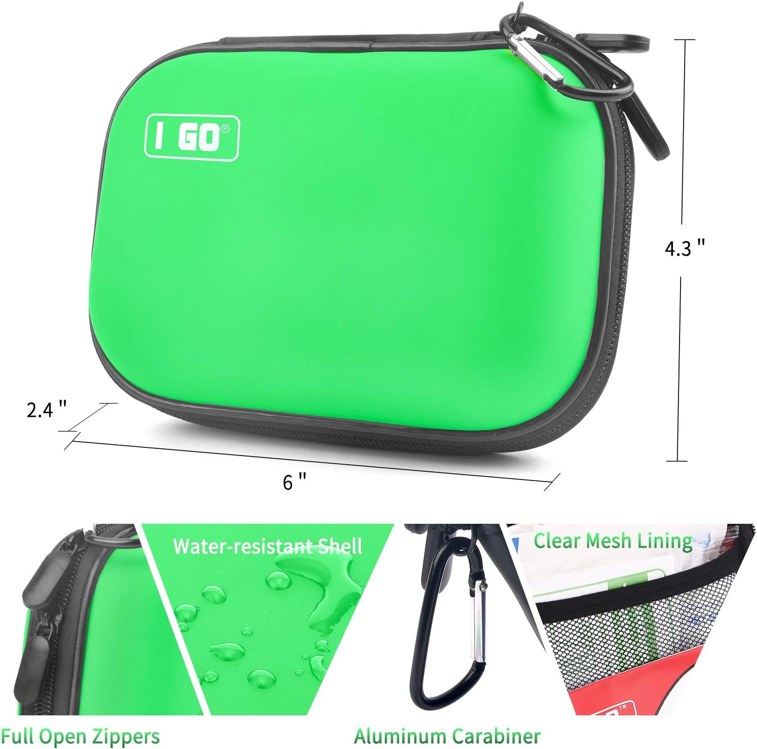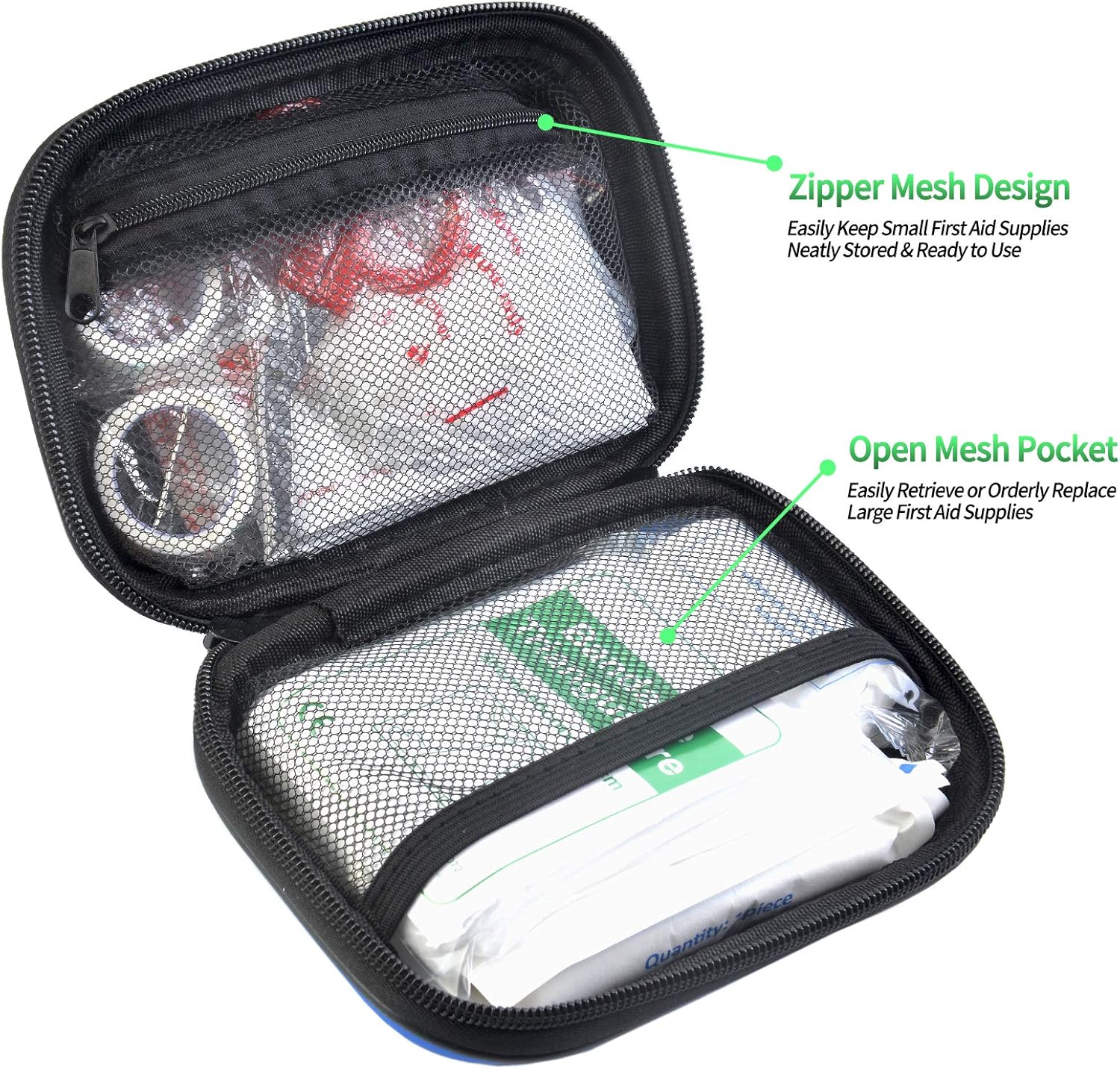 【Organization Survival Pouch】: Clear mesh lining and two-way full open zippers in water-resistant EVA pouch,this 1st aid kit provides you an organization and quick access to first aid supplies in an emergency