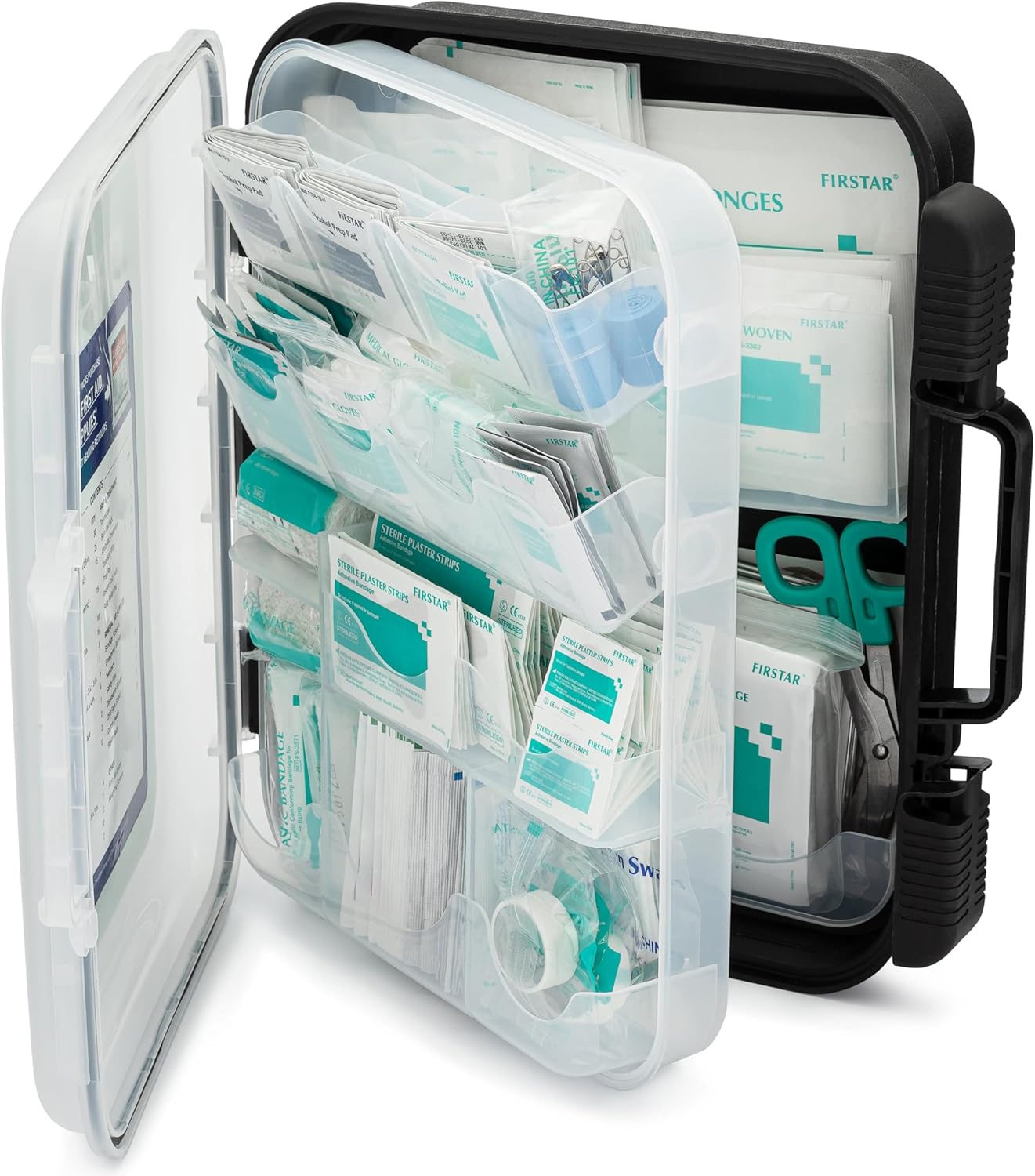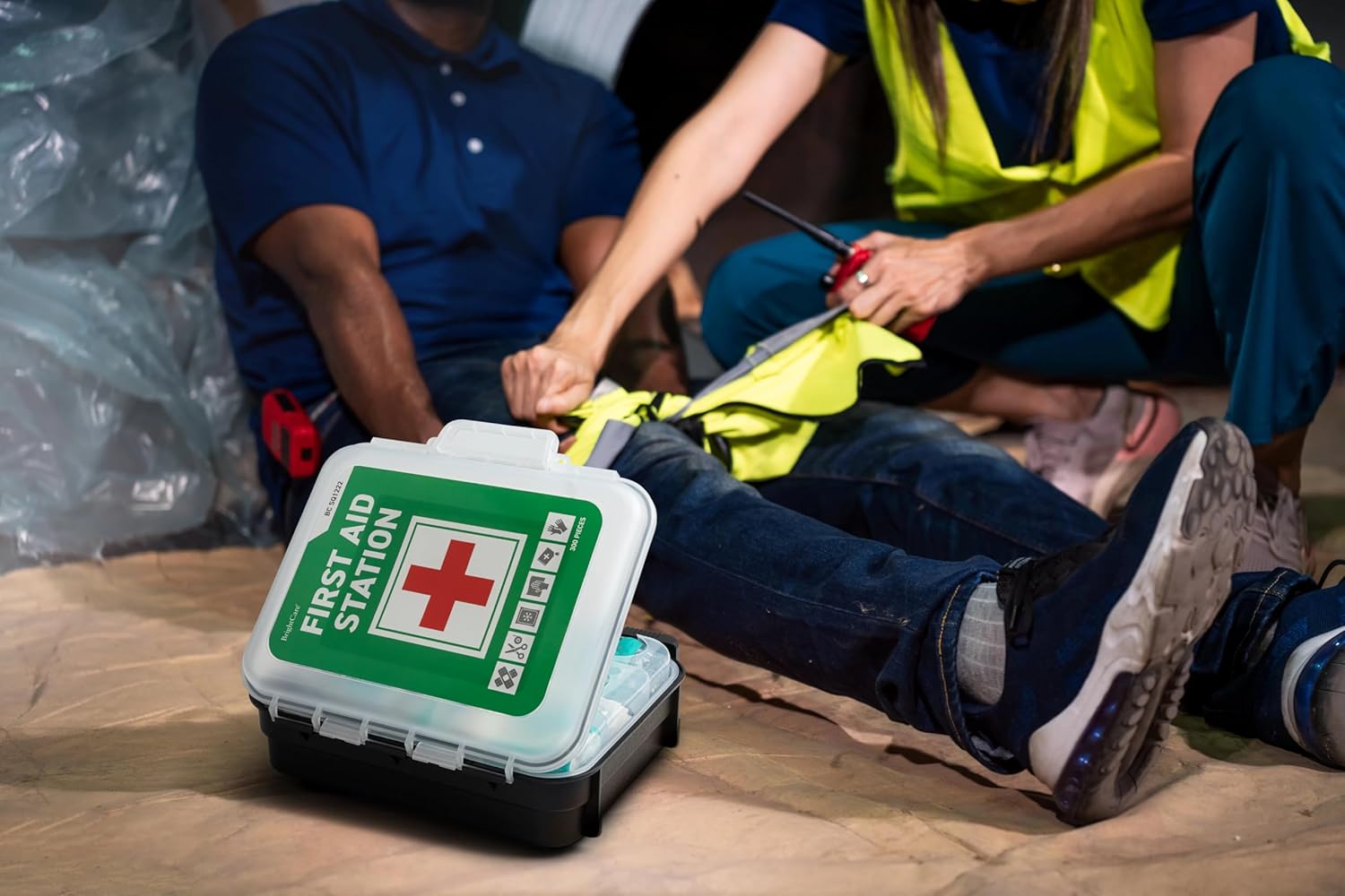 Stocked with bandages, gauze, dressings, gloves, CPR masks, and more, it helps keep employees and customers safe.