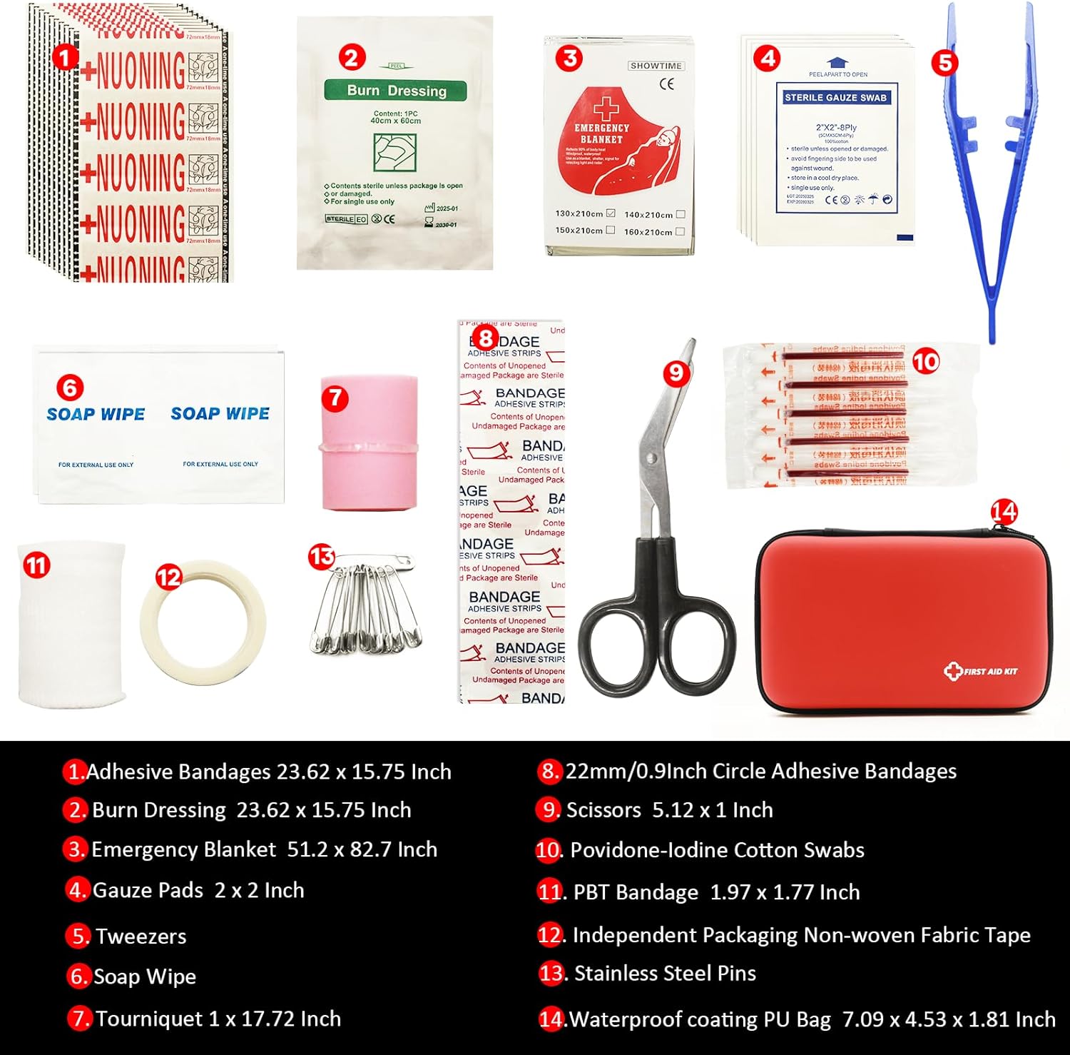 PROFESSIONAL-GRADE COMPLETE SUPPLIES: Packed with over quality essentials including assorted bandages,soap wipe, povidone-iodine cotton swabs,tweezers, and a tourniquet to handle cuts, scrapes, sprains, and emergency bleeding effectively.
