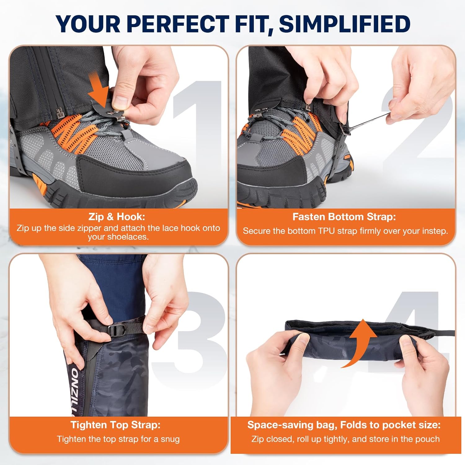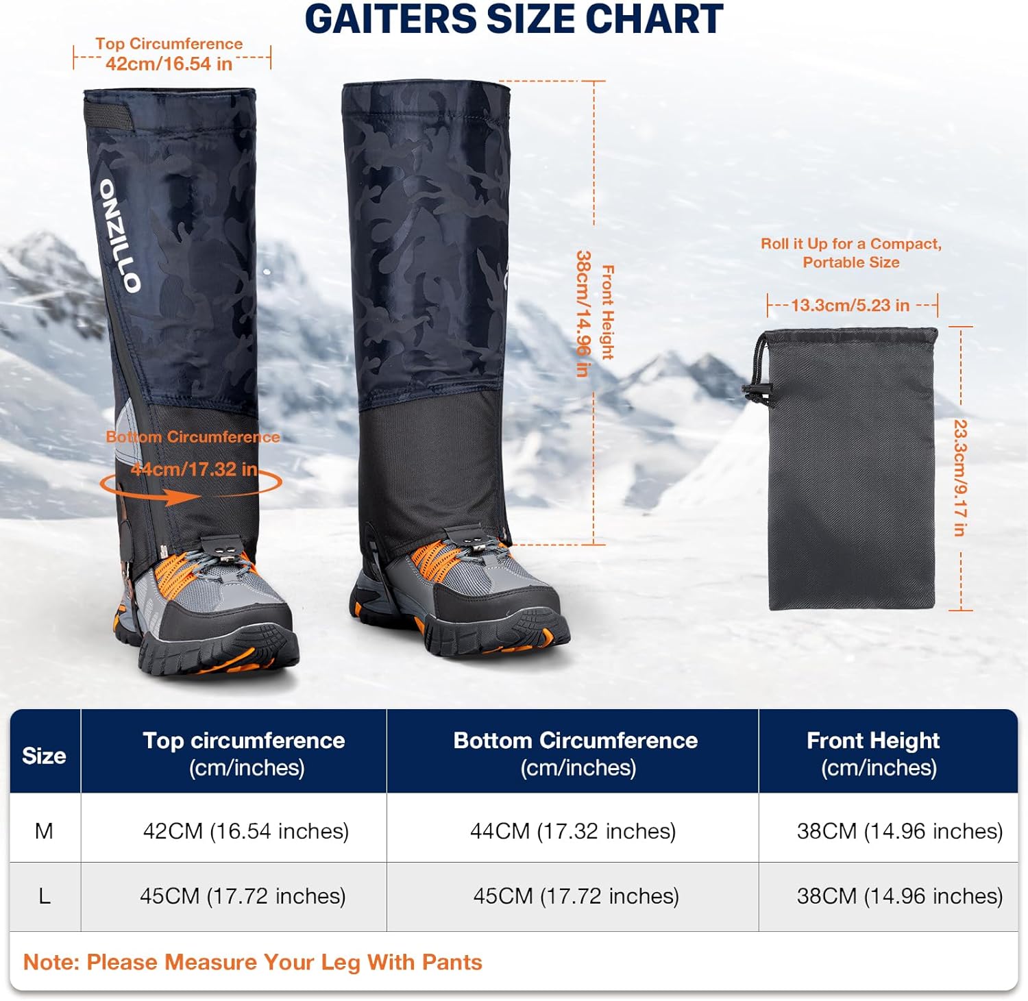 【Compact & Portable】 Designed to be lightweight and packable, gaiters for men and women can be easily folded and stored in the included compact carry pouch (recommended to roll before storing for maximum space efficiency). Easily fits into any backpack, making them ideal for all your on-the-go adventures