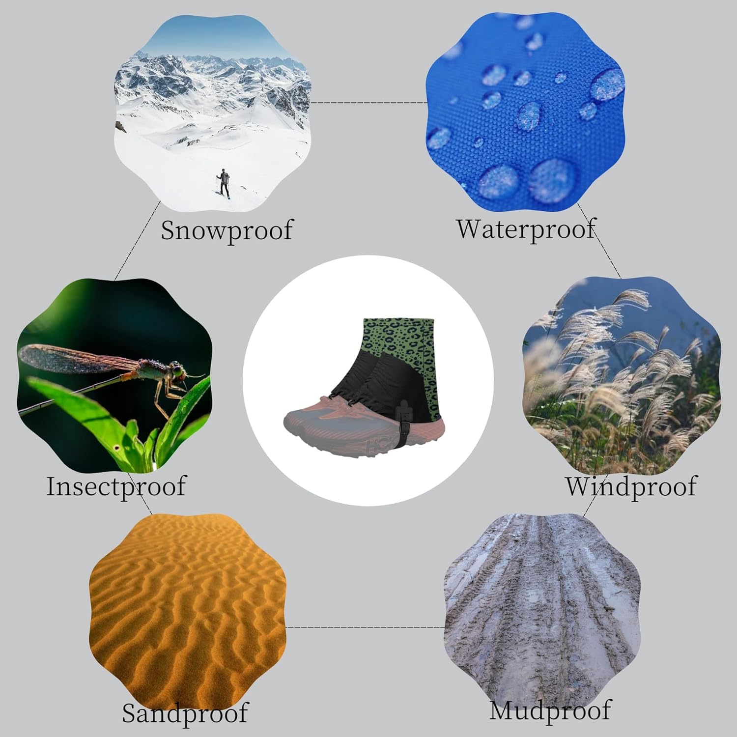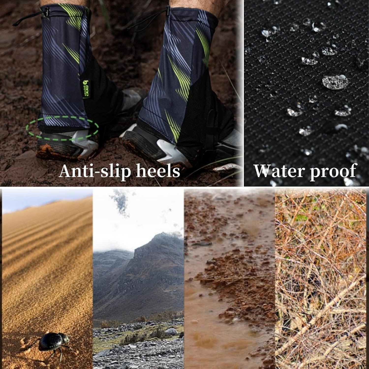 Dustproof,waterproof and sandproof: The gaiters are made of high-density waterproof Oxford cloth,which can completely wrap the shoes,effectively block the penetration of snow, rain and mud, avoid discomfort caused by moisture, extend the service life of the shoes, and always keep your feet dry and comfortable in outdoor areas, and prevent sand and debris from entering the shoes.