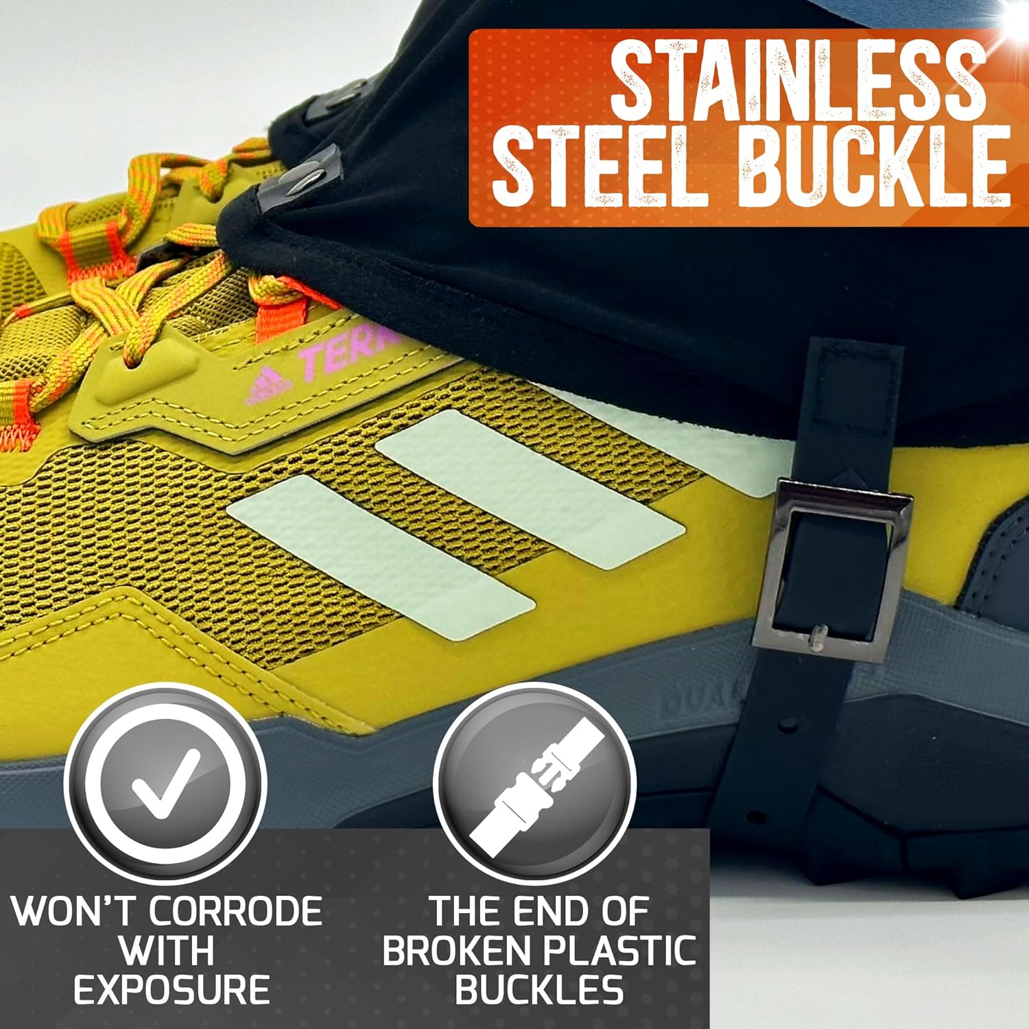 ADJUSTABLE; Make gaiters for running shoes that don’t fit perfectly a thing of the past; Our gaiters for running feature adjustable velcro top fittings for your unique size; We’ve also included vertical velcro fasteners so your ankle covers for shoes shape to the girth of your body; What’s more, Pike Trail gaiters also include adjustable straps with a rustproof stainless steel buckle