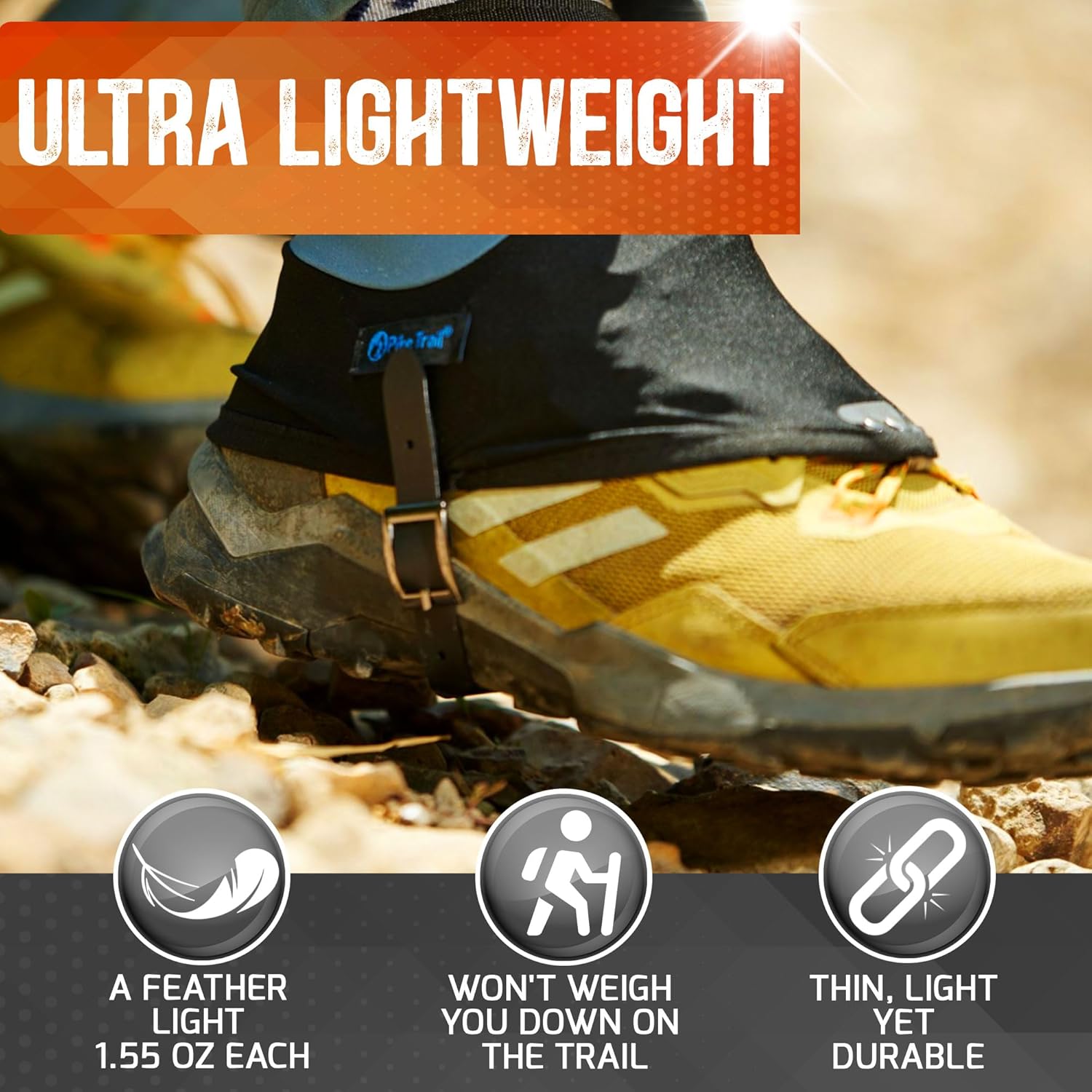 STRONG; Pike Trail running gaiters for shoes feature rock solid design with reinforced double stitching; Tried and field tested in all conditions, our gaiters for running shoes are designed to go the distance; When you need trail gaiters for running shoes that are as tough as you are, trust only Pike Trail