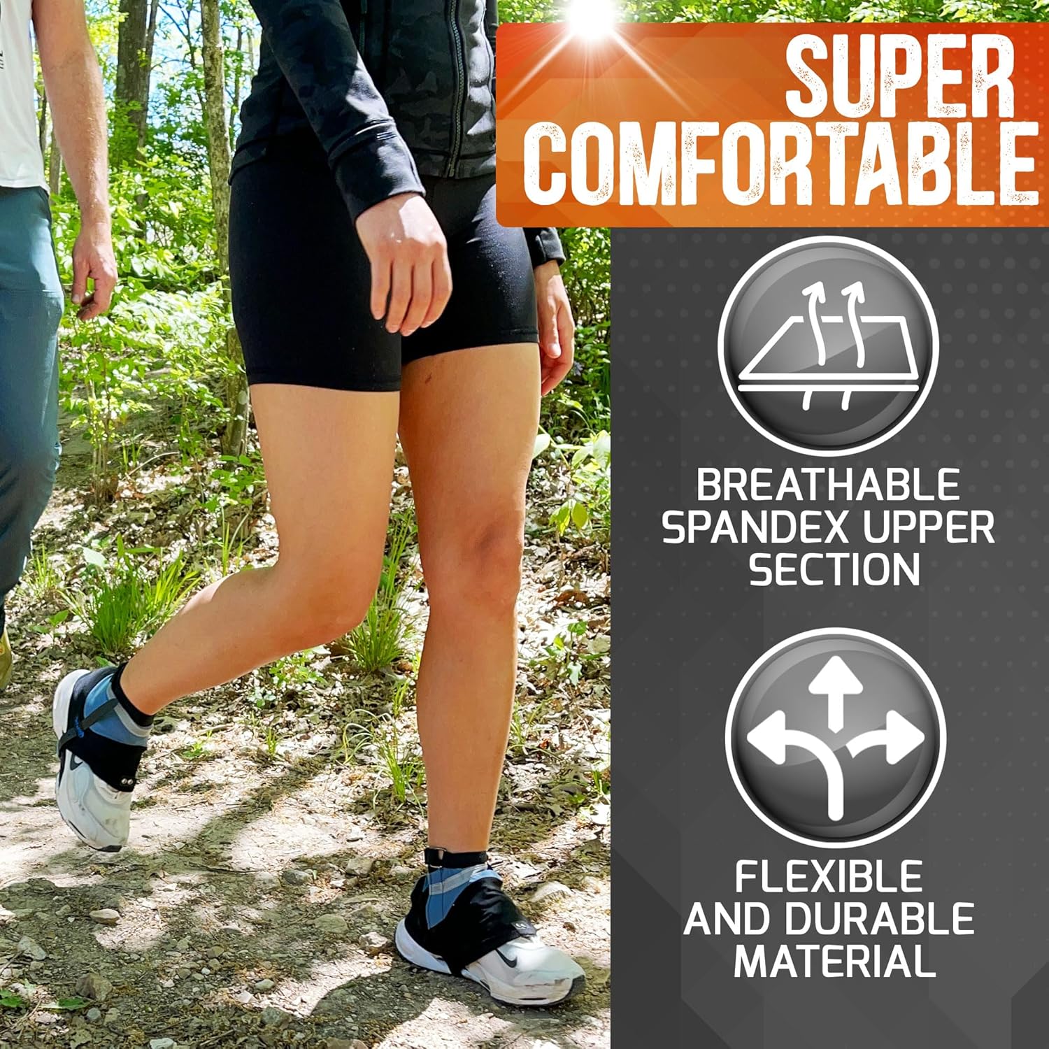 BREATHABLE; Upgrade to running shoe gaiters that have been engineered for comfort; Our trail running gaiters mens and womens models have a spandex upper section that’s crafted for airflow; This allows for better circulation, meaning your shoe gaiters for trail running are breathable and comfortable