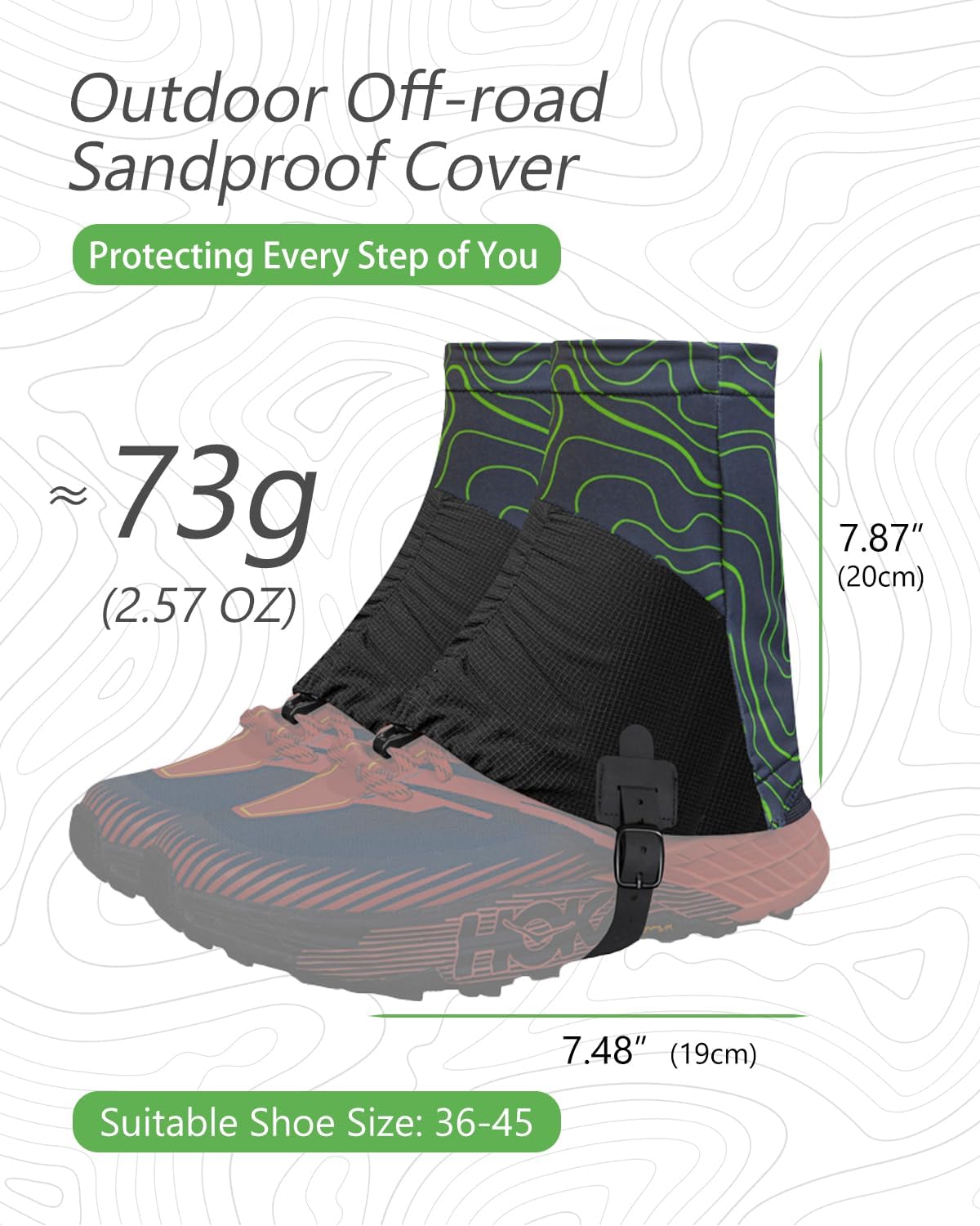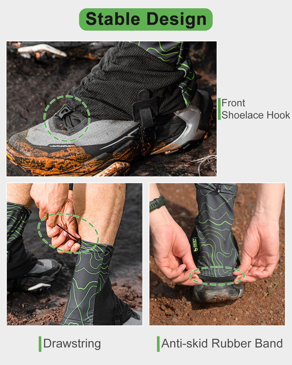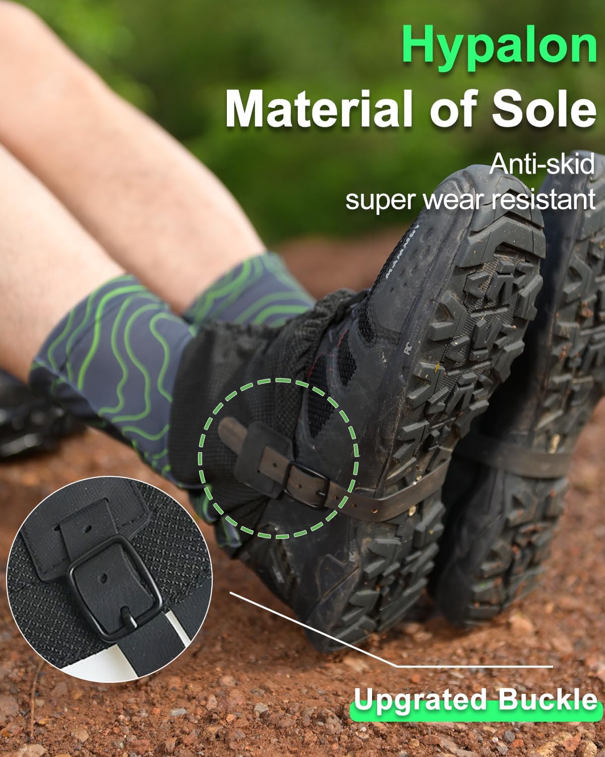 Easy On & Secure Fit: These hiking gaiters feature adjustable top fasteners, a durable TPU foot strap, and a snap fastener hook at the bottom, ensuring a customizable, snug fit over hiking boots and shoes. Quick and simple to put on and take off – perfect boot gaiters for the trail.