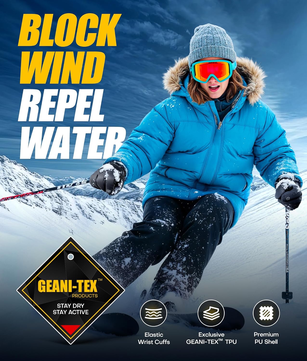 TRIPLE PROTECTION FOR EVERY SNOW JOURNEY! Featuring exclusive GEANI-TEX technology, these ski gloves repal rain and snow while wicking away moisture to keep your hands dry in freezing conditions. The upgraded PU shell with a waterproof coating lets water slide off instantly, while its high-density structure forms a strong wind-blocking barrier. Elastic wrist cuffs seal out cold air and snow for all-day warmth. Conquer every mountain with confidence under triple-layer weatherproof protection.