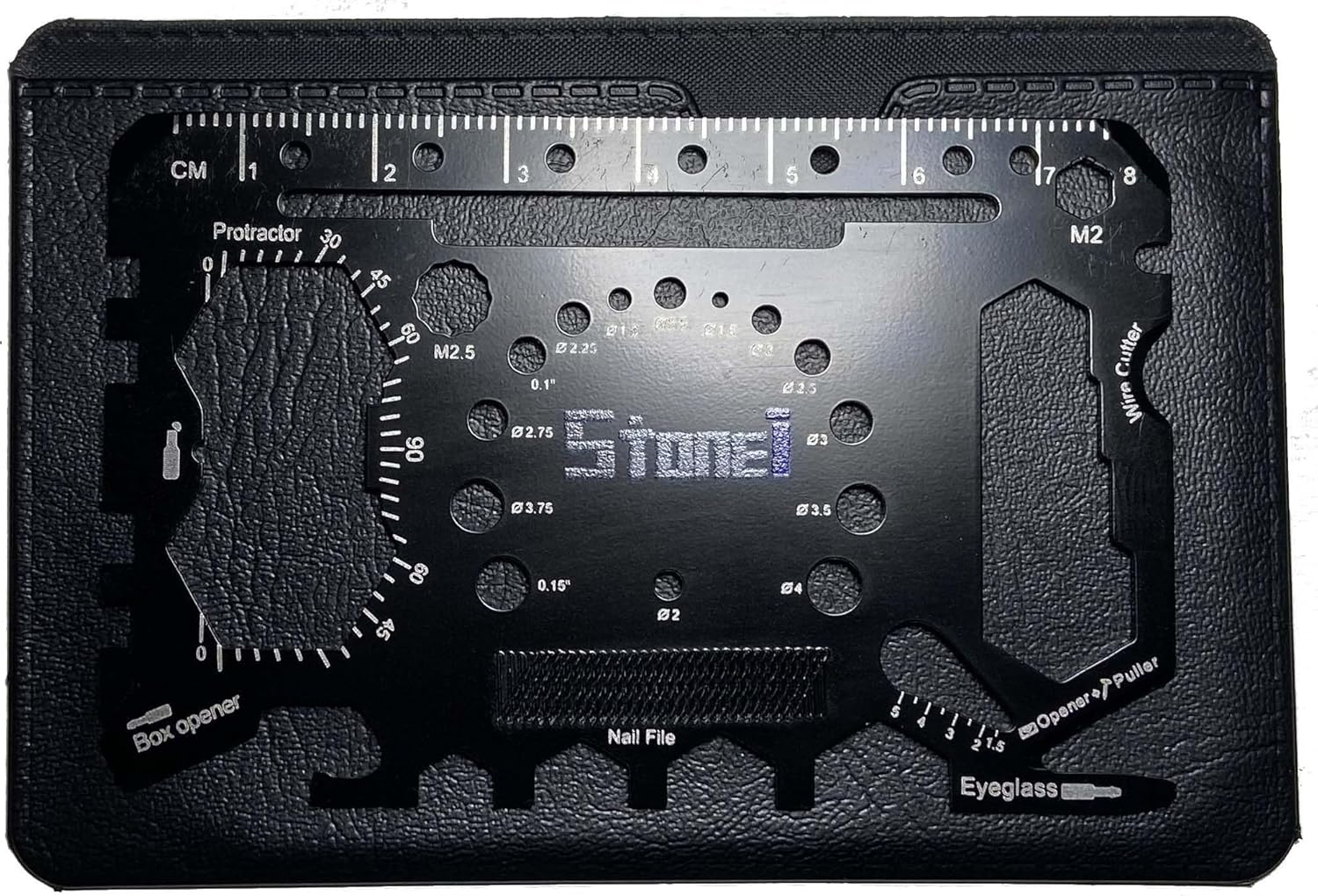 Stone Tone One 52-in-1 Multitool Multifunction Tool Card Premium Gift Package comes with a genuine leather card holder and a premium black gift box (Polyurethane Pouch included as well). Genuine leather card holder carries up to 6 cards, and has a compartment for carrying cash. Made from heat reinforced steel, this multitool is made to stand the test of time, and will not break so easily. Product is suitable for carry in wallet, purse, or pockets. Compared to competitors, this is the most functional multitool card on the market, and it’s all in the compact dimensions of a credit card!