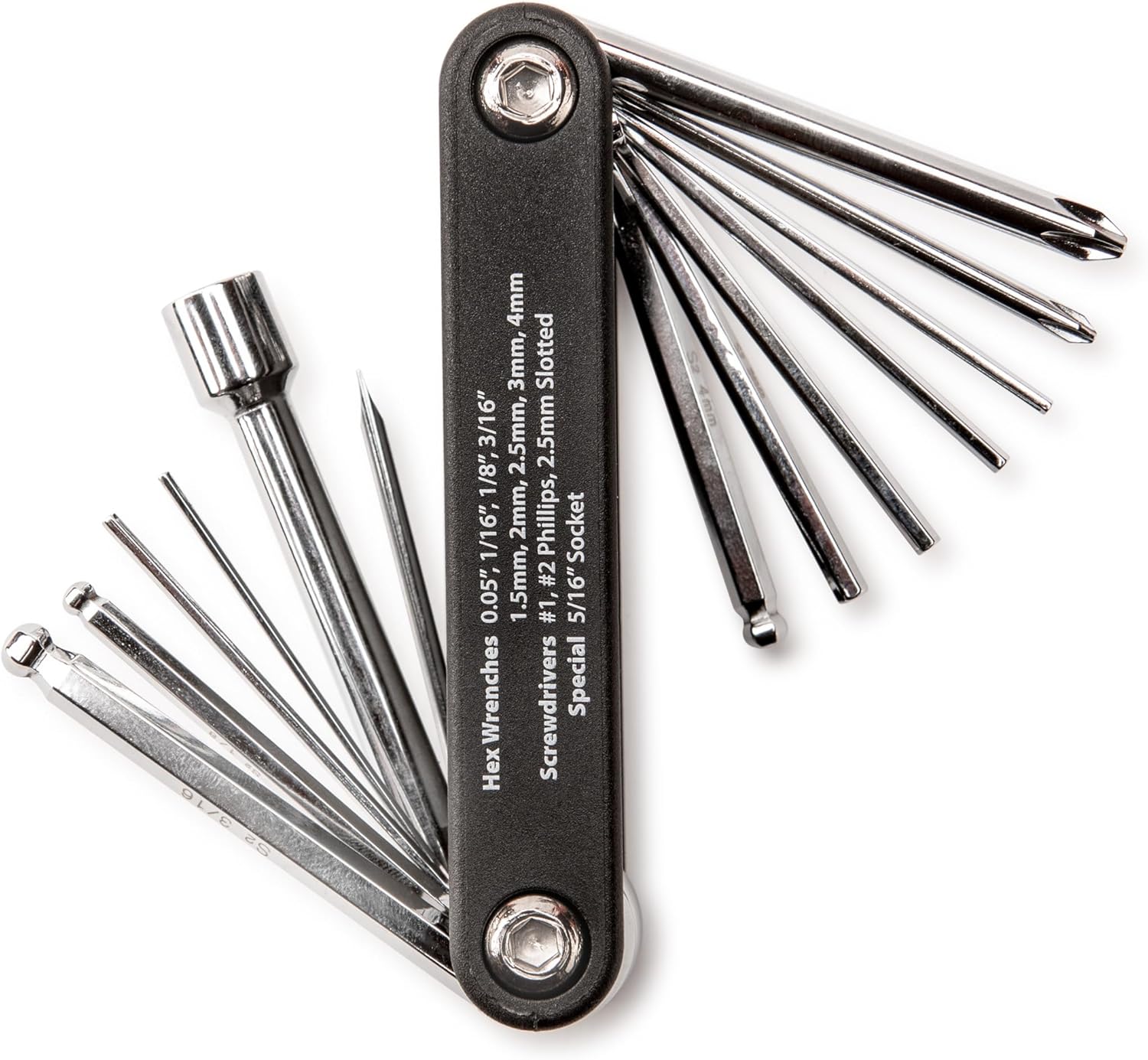 Includes: nine hex keys, two Phillips screwdrivers, one flathead screwdriver, and a truss rod socket