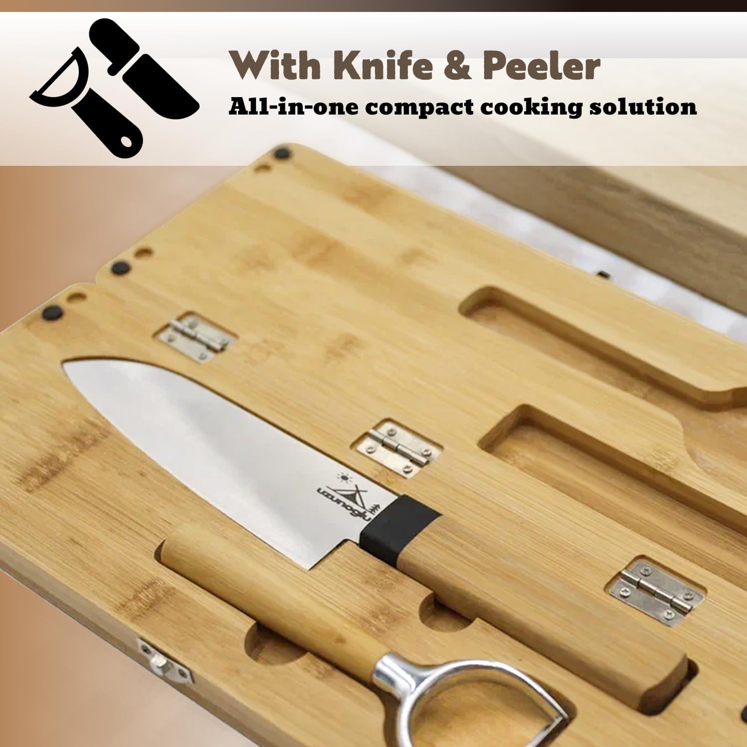 Protective carrying case with handles Foldable design for easy storage Integrated knife sharpener on the corner Includes high-quality knife & peeler Secure lock prevents accidental openings Perfect for home, office, camping, and picnics Durable and lightweight for daily use All-in-one compact cooking solution