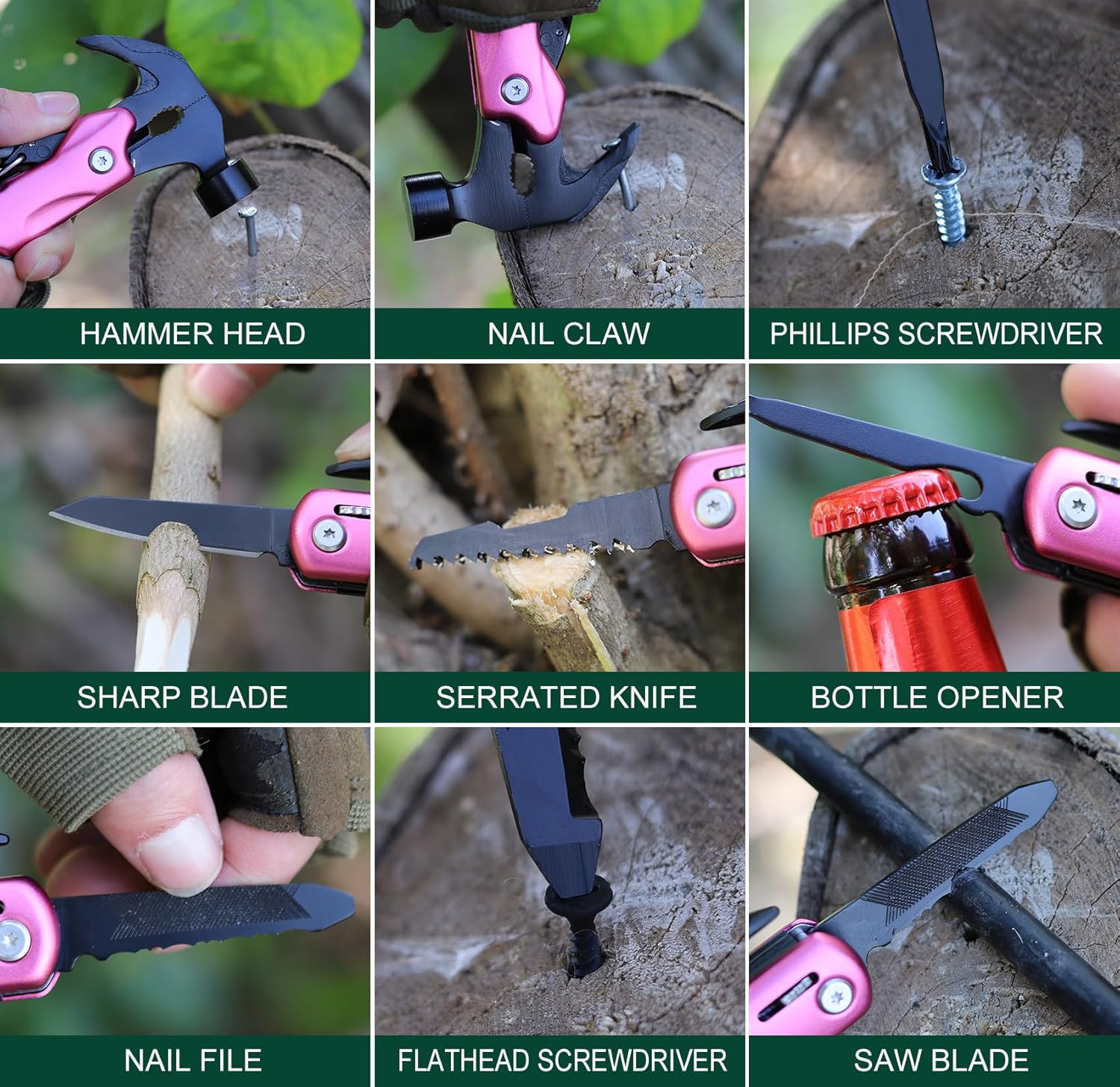 It is equipped with a nail care file, a sturdy claw hammer for outdoor needs, sharp blades and serrated knives for cutting, a screwdriver for DIY projects, and pliers for gripping and cutting. Its sleek and practical design makes it an ideal companion for various tasks.