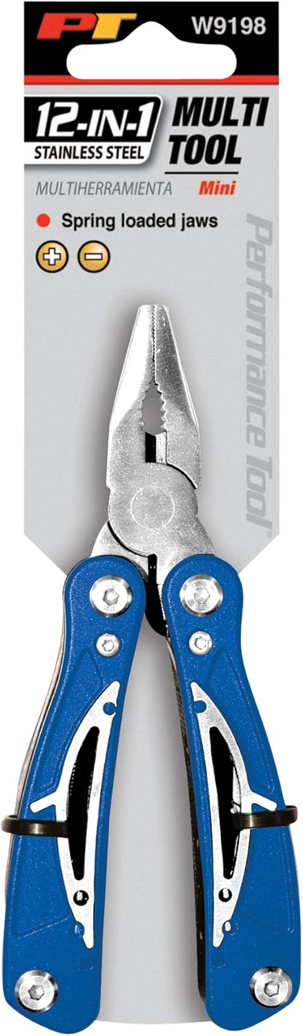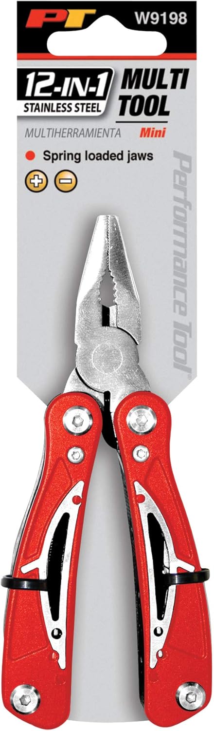 Performance Tool Mini Multifunction Tool. Includes Long Nose & Curved Jaw Pliers, Wire Cutters, Saw, Small, Medium, &Large Slotted Screwdrivers, Phillips Screwdriver, 2-Sided File, 0.5 & 1.5″ Knife Blades, Bottle Cap Opener.
