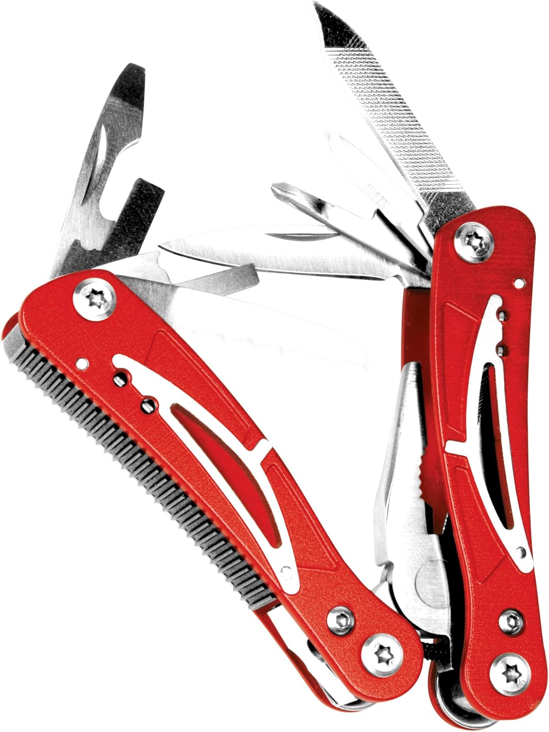 Functions:Long nose & curved jaw pliers, wire cutters, saw, small, medium, &large slotted screwdrivers, Phillips screwdriver, 2-sided file, 0.5 & 1.5-Inch knife blades, bottle cap opener.