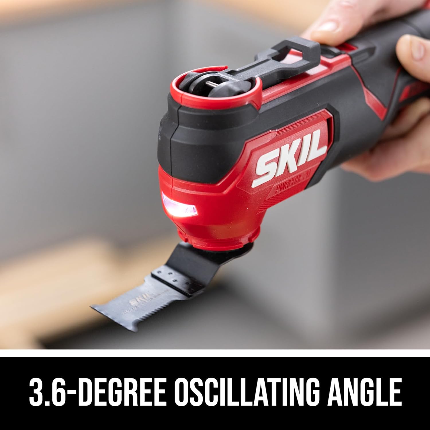 Sand, scrape, chip, and more with the SKIL 20V Brushless Oscillating Multi-Tool Kit.Its 3.6-degree oscillating angle delivers high-performance cutting, sanding, and scraping, and it easily transitions between tasks like scraping for carpet and flooring removal, cutting drywall to install electrical outlets, and sanding doors with tool-free blade changes. Its vibration reduction system delivers 80 percent less vibration compared to SKIL models without the VRS feature for more comfortable work. Clearly see your work with the onboard LED light. The kit includes the cordless multi-tool, 20V 2.0Ah battery, 20V charger, sanding pad, (9) sandpapers, HCS wood blade, and HCS segment blade.