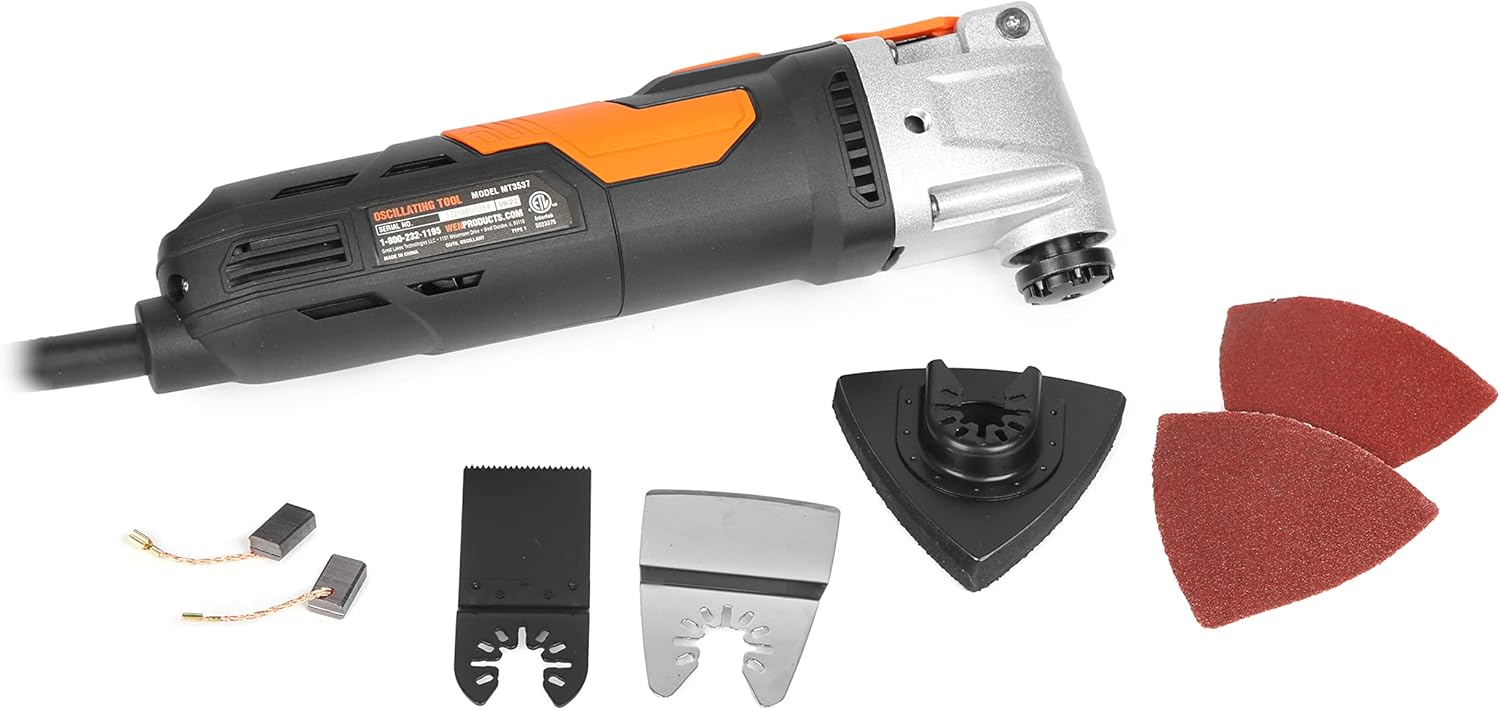 Remember when you had to saw in that unreachable corner? Cut, sand, and scrape in the hardest-to reach places with the WEN Variable Speed Oscillating Multi-Tool Kit. With a slew of attachments and a compact and lightweight design, this tool provides a variety of functions for whatever your job may require. Adjust the variable speed dial anywhere from 10,000 to 20,000 oscillations per minute depending on the needs of the task at hand. The powerful 3.5-amp motor makes easy work of sawing, sanding, deburring, cutting, and more. This kit includes a tool storage bag, a scraper blade, a triangular sanding pad, sanding papers, and a saw blade. Plus, if there is an additional attachment you want to buy, the WEN Multi Tool is compatible with the majority of multifunction tool blades and accessories available on the market. The quick-release lever allows for quick and simple tool-free blade changes. Don’t let tight corners and hard-to-cut edges stand in your way anymore. Trim base molding and scrape paint and carpet. Easily cut through cables, downspouts, air ducts, drywall and pipes. Sand down cement, concrete, plaster, stone, tile adhesive, paint and wood all with the WEN Variable Speed Oscillating Multi Tool. And because it’s a WEN Product, your multi-function tool comes backed by a two-year warranty, stocked inventory of replacement parts, and a friendly customer phone line, all to make sure that you remember WEN.