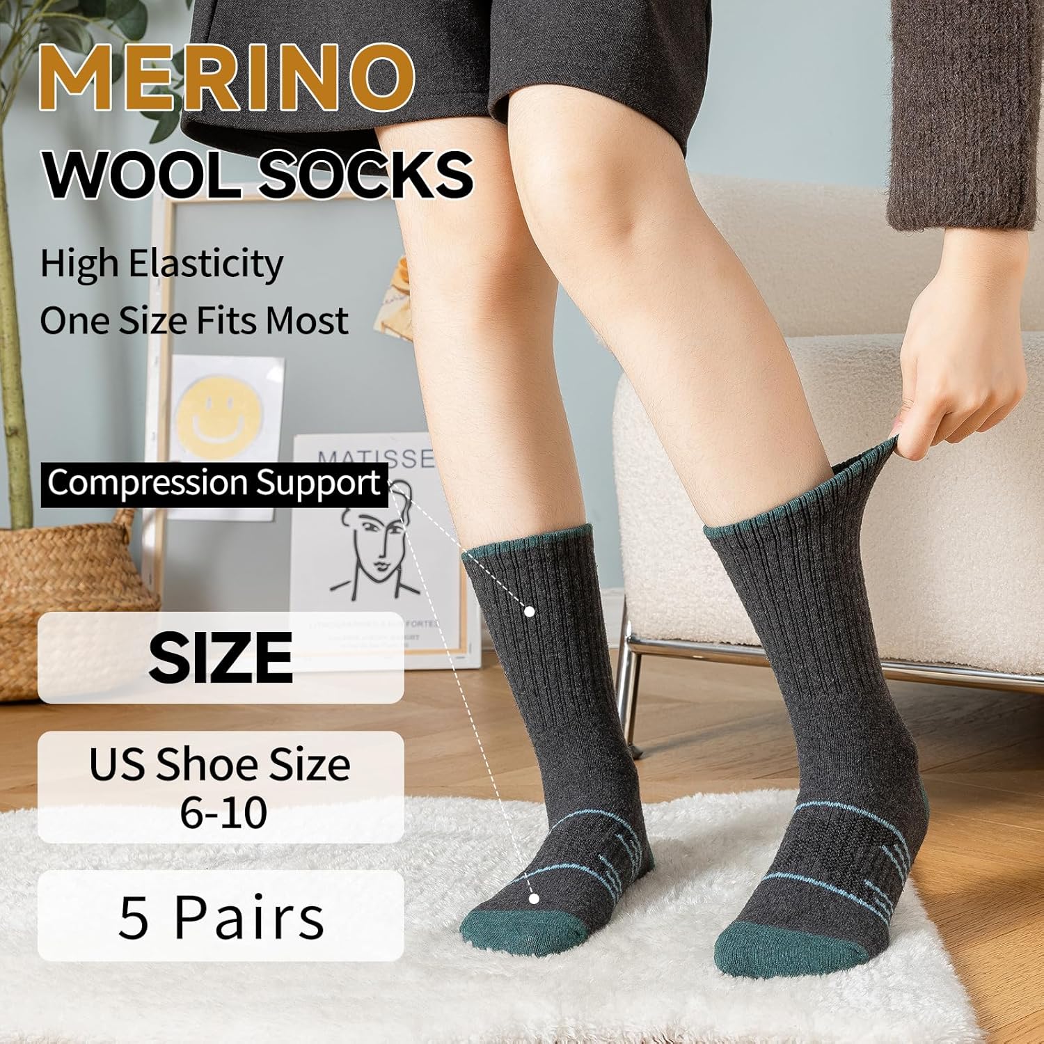 Size of our wool socks: US Shoe Size 6-10Color of our wool socks: MulticolorMaterial of our wool socks: 35% Merino Wool + 36% Cotton + 29% PolyesterPackage of our wool socks: 5 PacksStyle of our wool socks: Womens Vintage Style Perfect Crew Socks