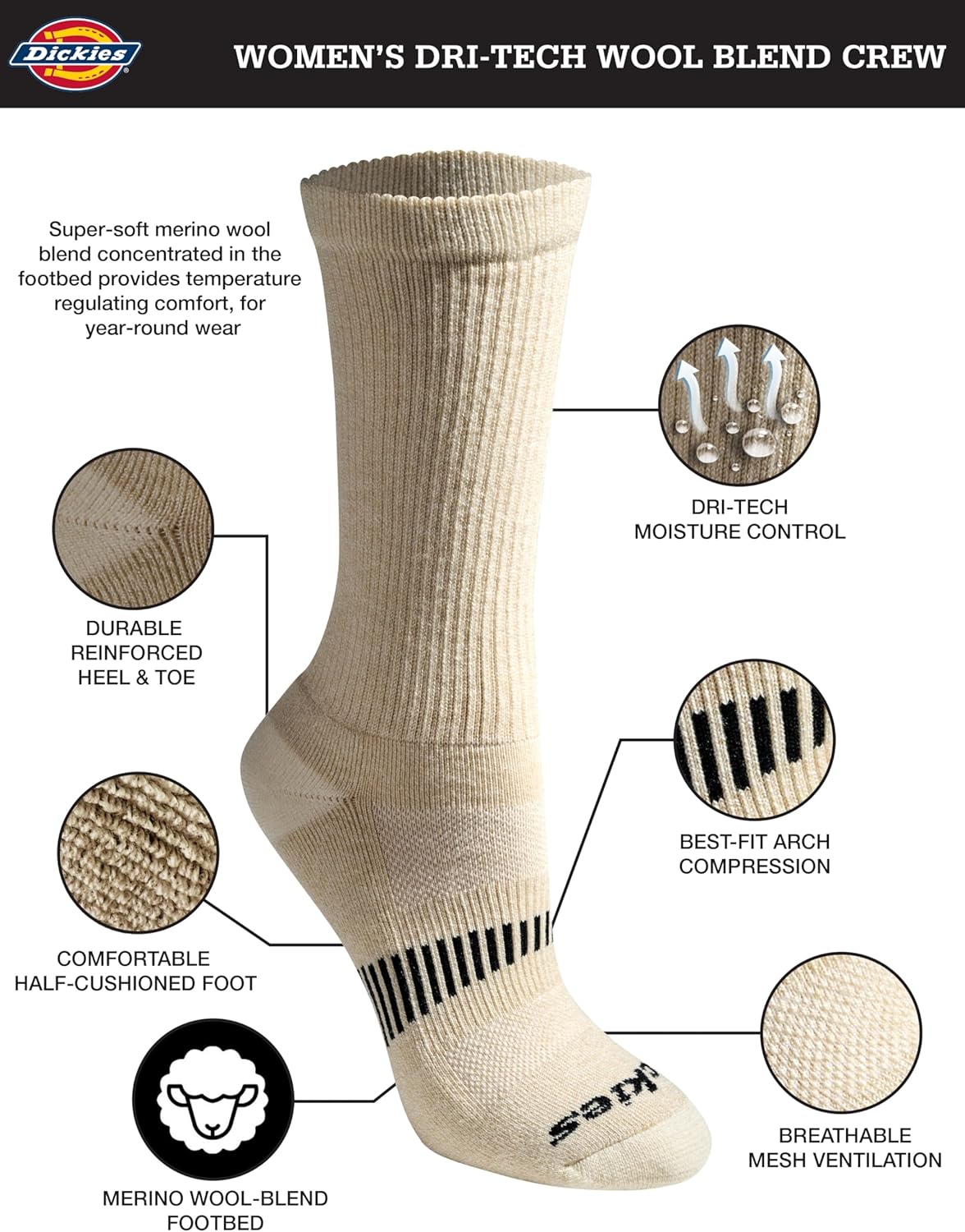 Dickies Women’s Dri-Tech Moisture Control Crew socks combine moisture wicking fibers and mesh ventilation channels to keep feet dry and comfortable. Since 1922 Dickies has been making hard-duty work products built to stand up to whatever life throws at you. Dickies Work Socks are built with purpose to deliver superior comfort and performance on and off the job. Dri-Tech Moisture Control Sock Collection features: Moisture Management to help keep your feet cool, dry, and comfortable throughout the day.