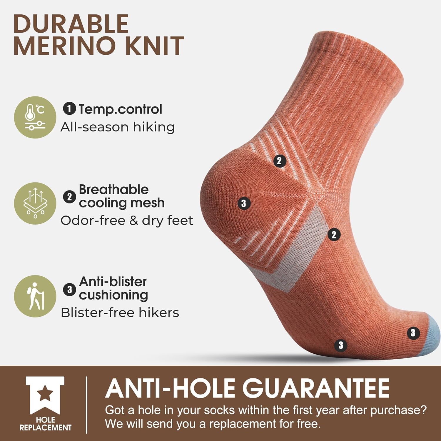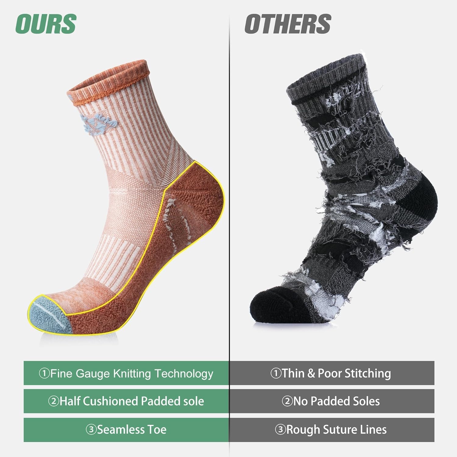Customers find these hiking socks comfortable, with feet never feeling sweaty, and appreciate their cushioning for light hiking. They receive positive feedback for their quality, colors, and fit, being great for both hiking and running activities. However, durability is a concern as customers report holes developing in the ankle area after minimal wear. The thickness receives mixed reviews, with some finding it appropriate for casual use while others note it wears thin quickly.
