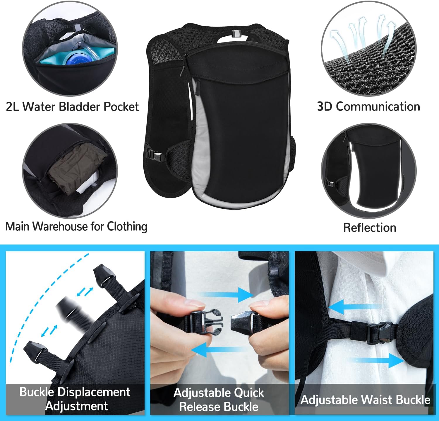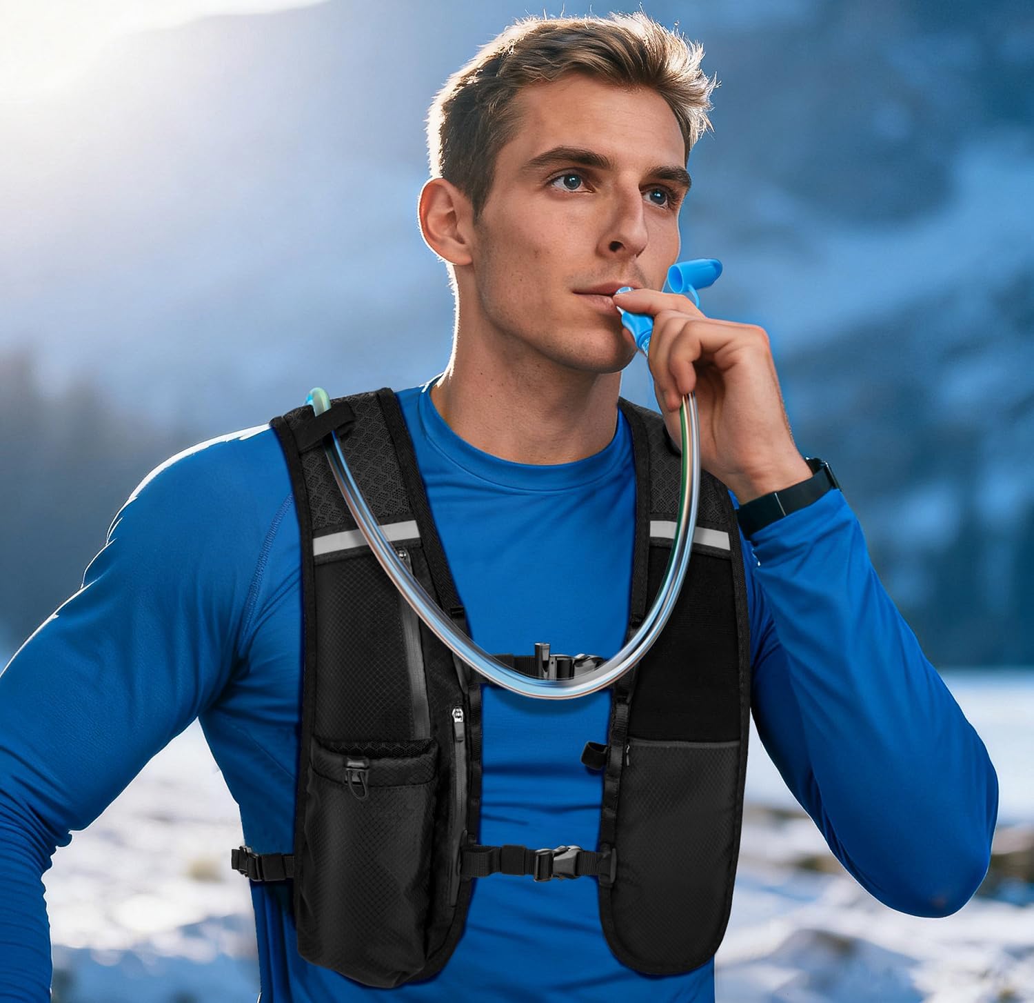 ✅ Hands-Free Hydration – Features a 2L BPA-free TPU water bladder with leak-proof technology, ensuring safe drinking during running, hiking, or cycling. The ergonomic bite valve allows easy sipping.