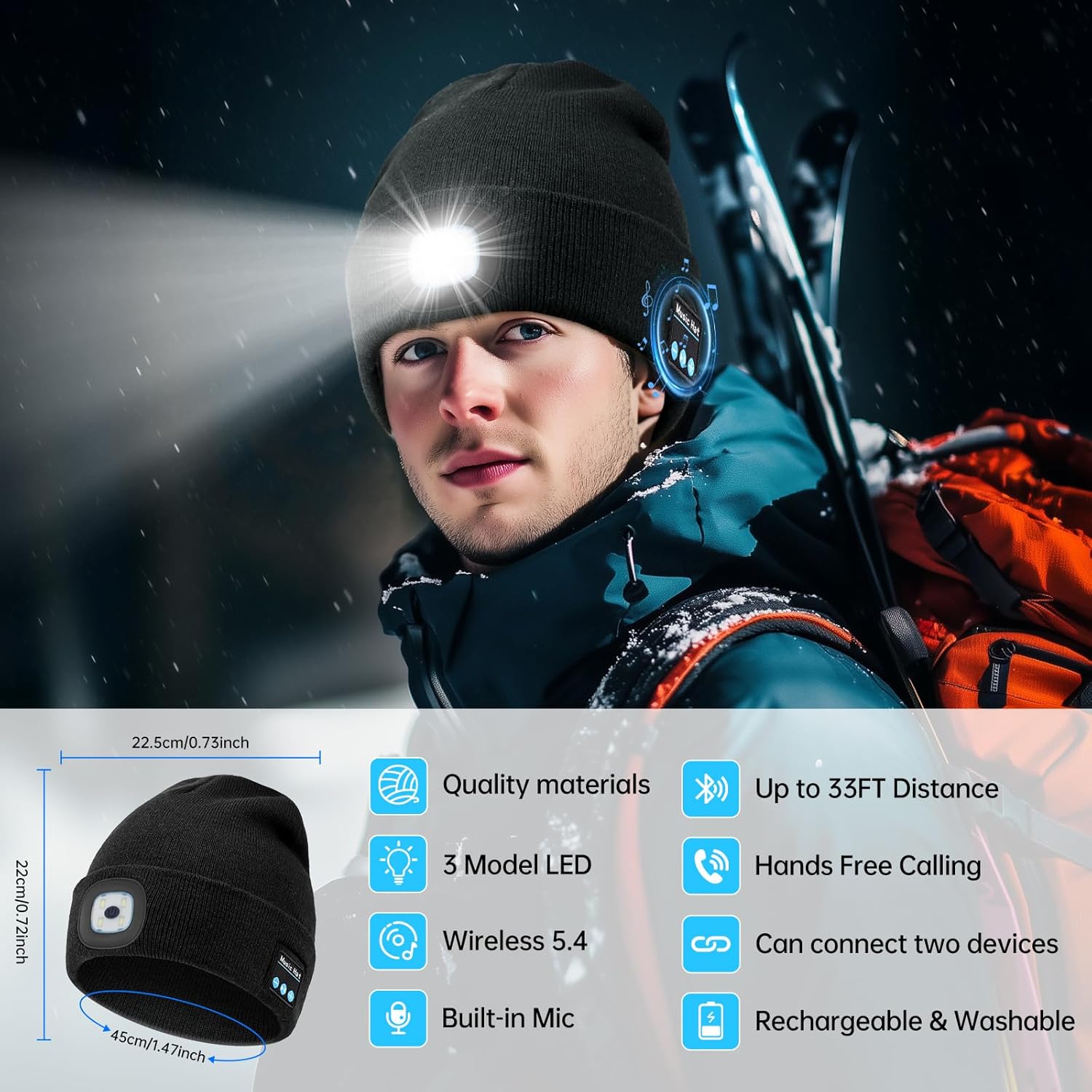 [3-in-1 Multi-Functional Design]: This knitted winter beanie hat innovatively integrates built-in Bluetooth headphones, and a bright LED headlamp to combine warmth, music and lighting. Whether commuting, skiing, or on an outdoor adventure, this is an ideal Bluetooth beanie with light, designed for a modern lifestyle of convenience and fun.