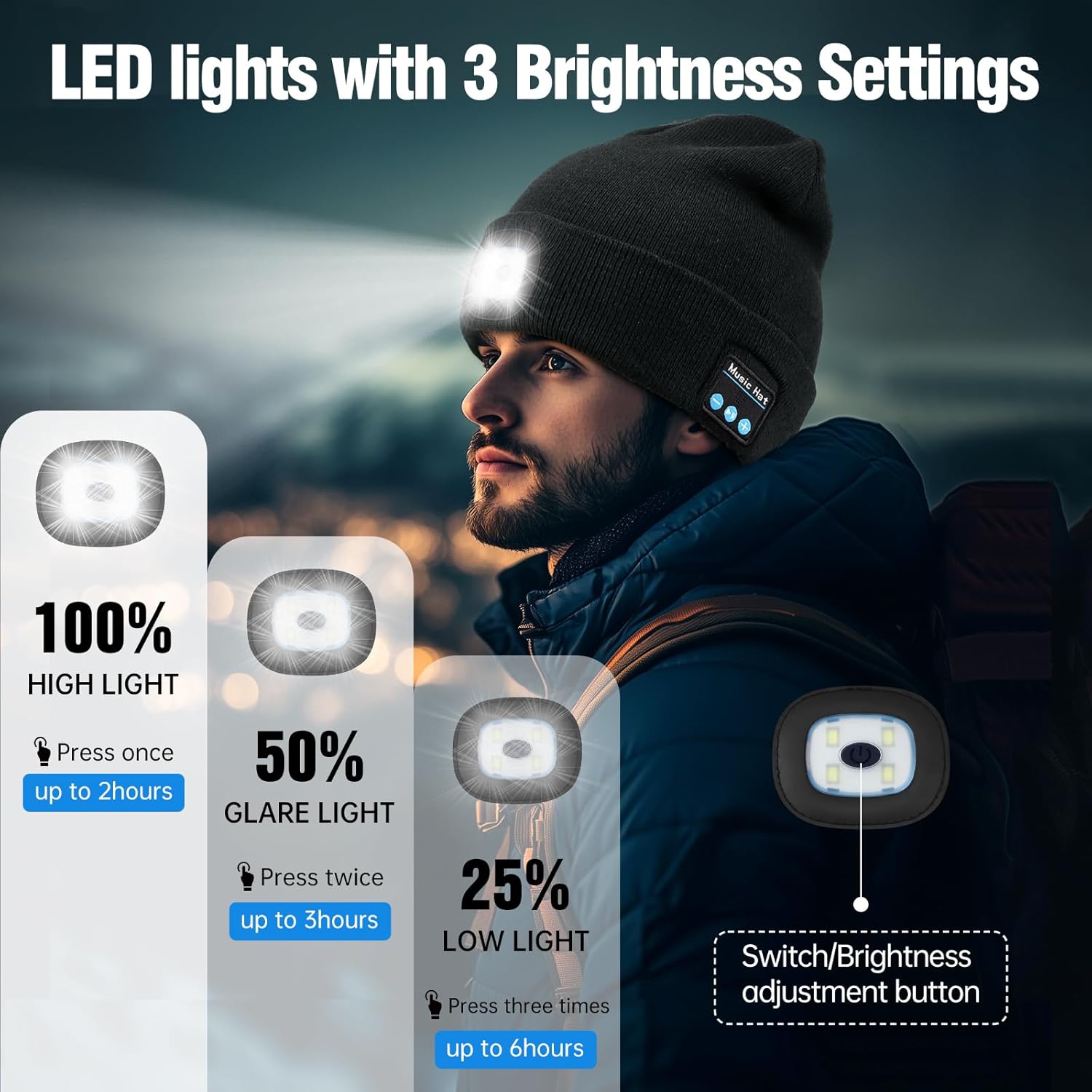 [Multifunctional Lighting System]: Built-in 4 high-performance LED light beads, providing lighting up to 125 lumens (7500K cold white light). This LED beanie hat features three adjustable lighting modes—high, medium, and low light—which can easily deal with various scenarios from night walking to emergency help. This headlamp beanie greatly improves your safety and visibility in dark environments, making it ideal for camping, hiking, fishing, working, and outdoor activities.
