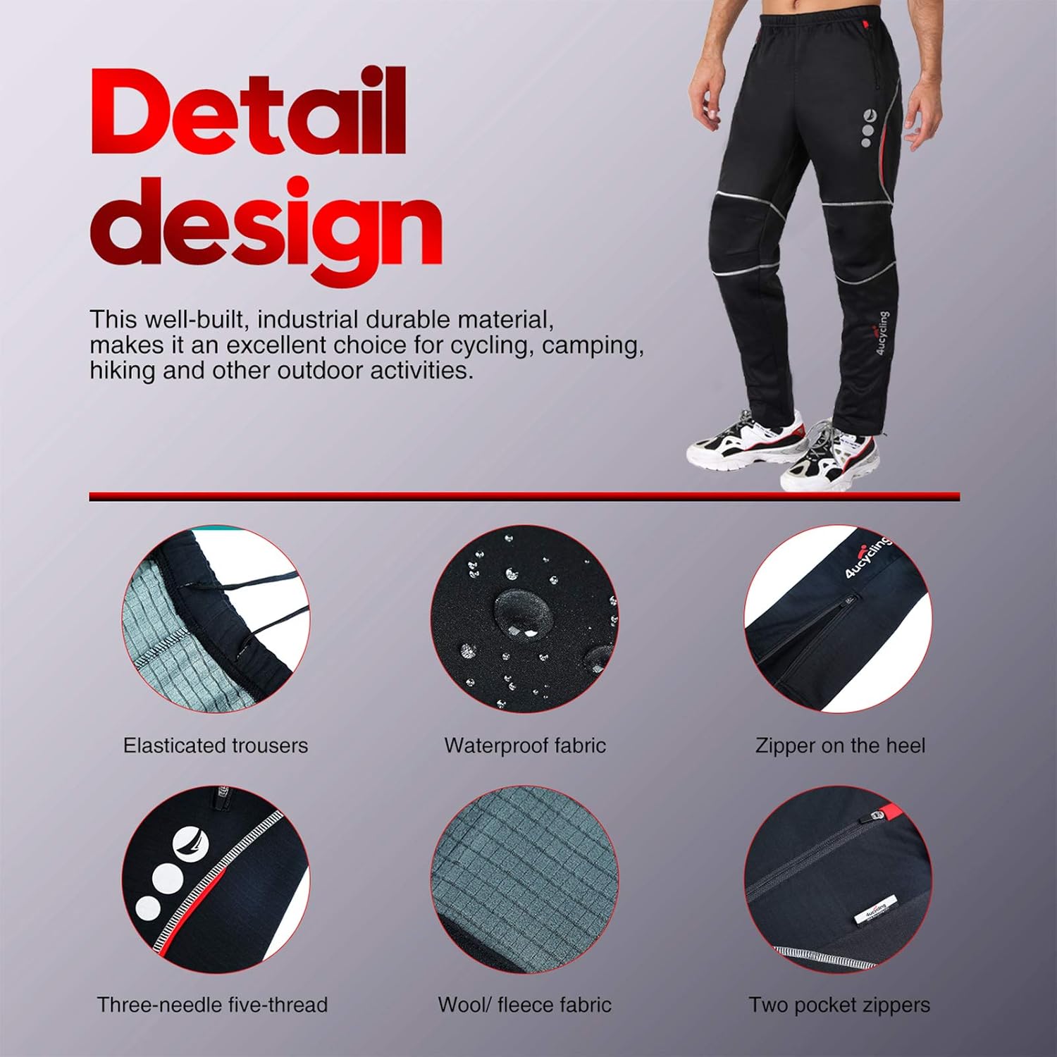 The 4ucycling sweatpants are made from high-end materials with a microfleece lining that is windproof and splash resistant to keep you warm in cold weather. The knees and pleated crotch enhance your range of motion for easy riding. Don’t let the cold weather keep you off your bike!