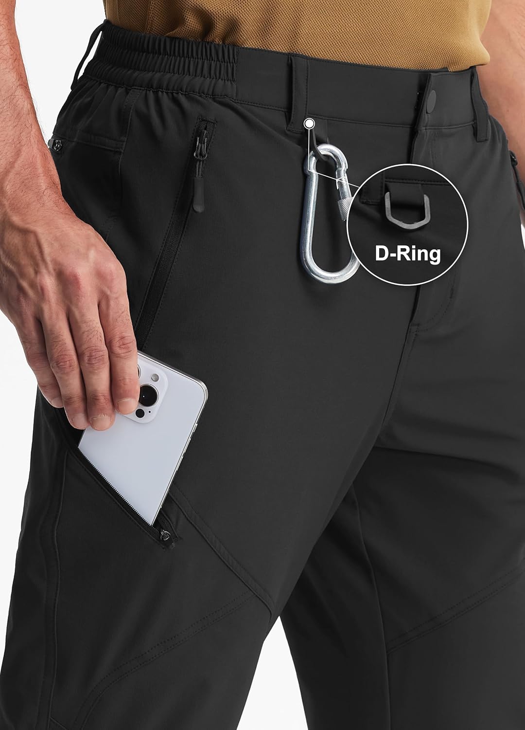 These pants have many pockets: 2 in the front, slant zipper pockets, 1 zipper pocket on the front side of the thigh, a rear pocket, and a d-ring buckle to hang a compass or water bottle. The pants are used for active lifestyles like hiking.