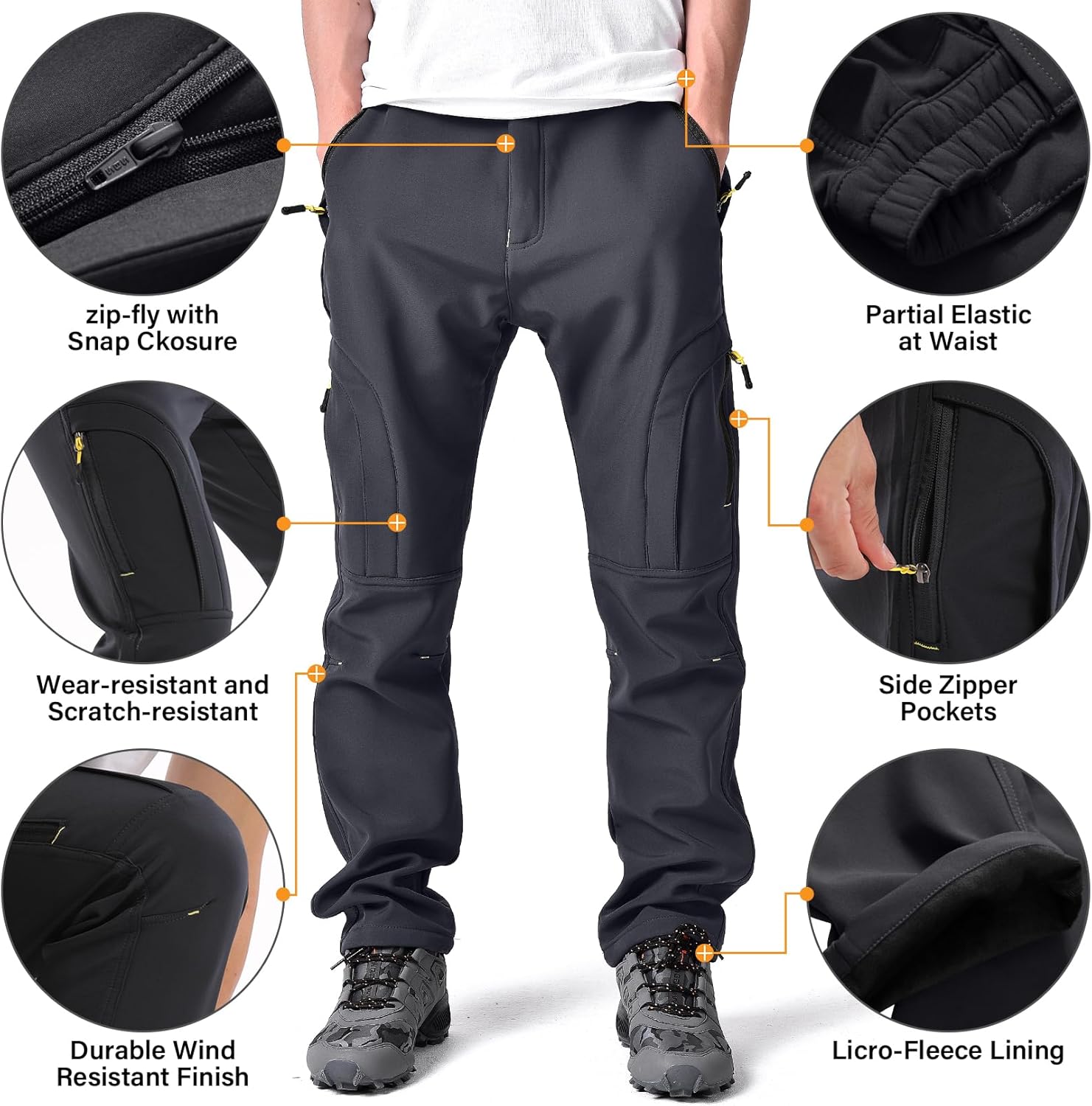 Softshell pants men : Insulated hiking pants Spandex soft shell fabric and lining with 100% Soft Polar Fleece. Fleece Lining with skin-friendly property offers you with superior moisture wicking treatment, breath freely, keep warmth and dry provides the excellent comfort and flexibility.