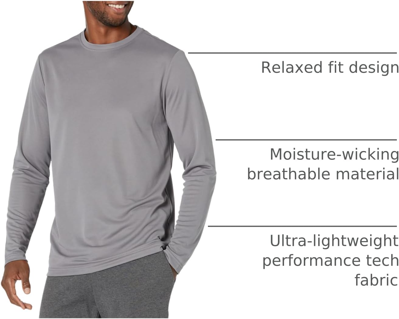 Experience comfort and versatility with our Amazon Essentials Men’s Performance Tech Long-Sleeve T-Shirt, crafted with performance tech fabric, offering an ultra-lightweight, breathable, and moisture-wicking experience that keeps you cool during workouts. The subtle honeycomb texture knit and 4-way stretch allow for more flexibility. With a relaxed fit through the shoulders, chest, and waist, coupled with a longer body length, our shirt provides added coverage and a comfortable range of movement.